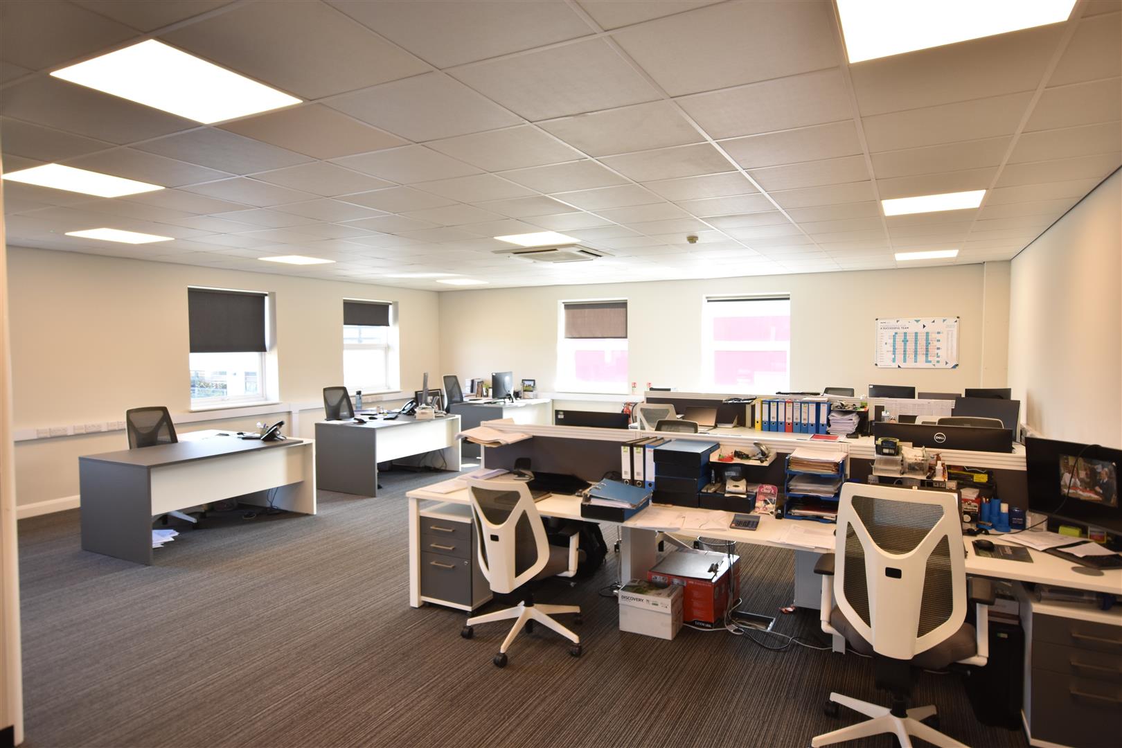 Office with fitted carpet, Mitsubishi air conditioning units and two store rooms off.