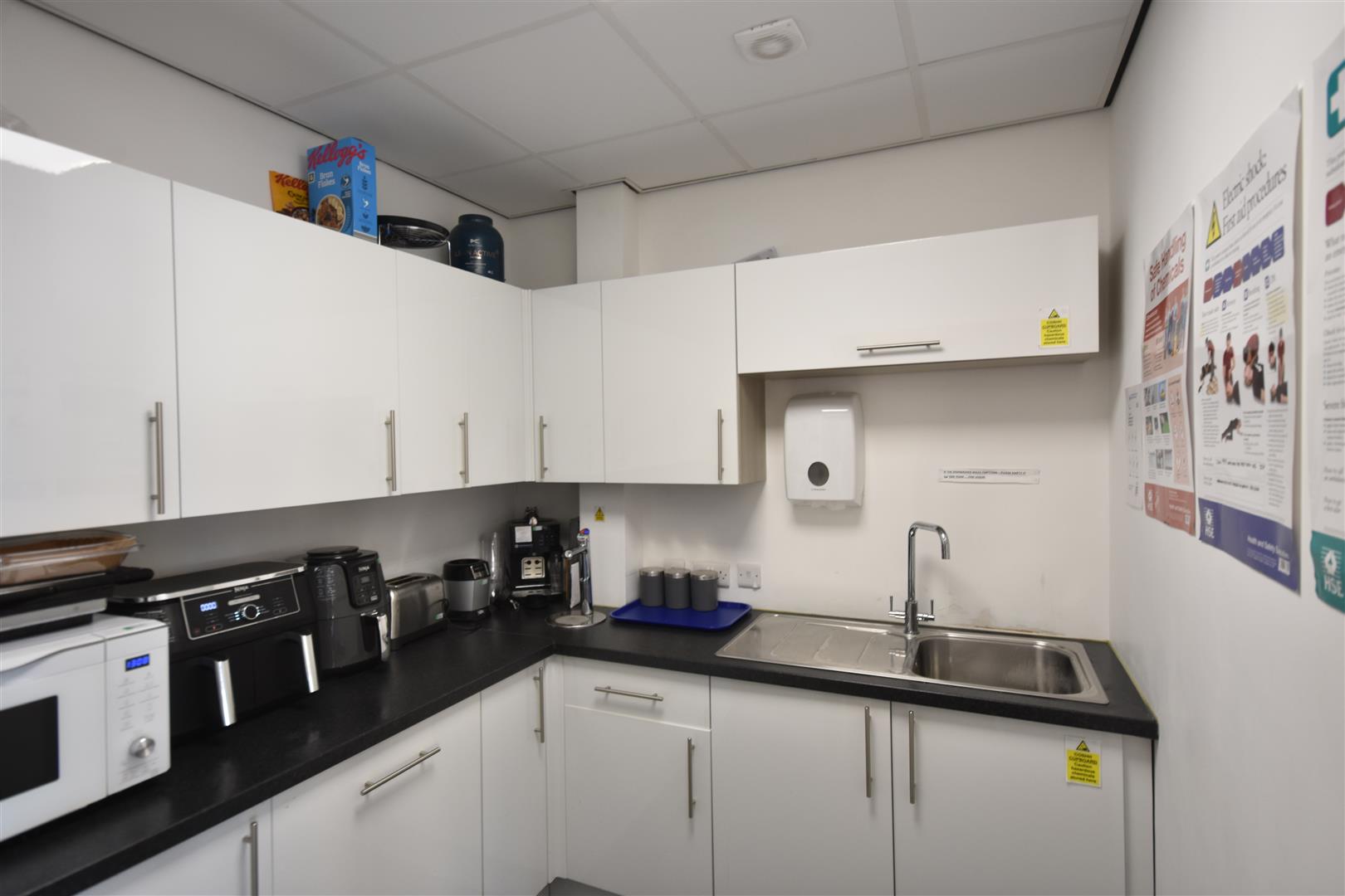 A main glass fronted reception area, staircase to the first floor and cupboard for IT equipment.