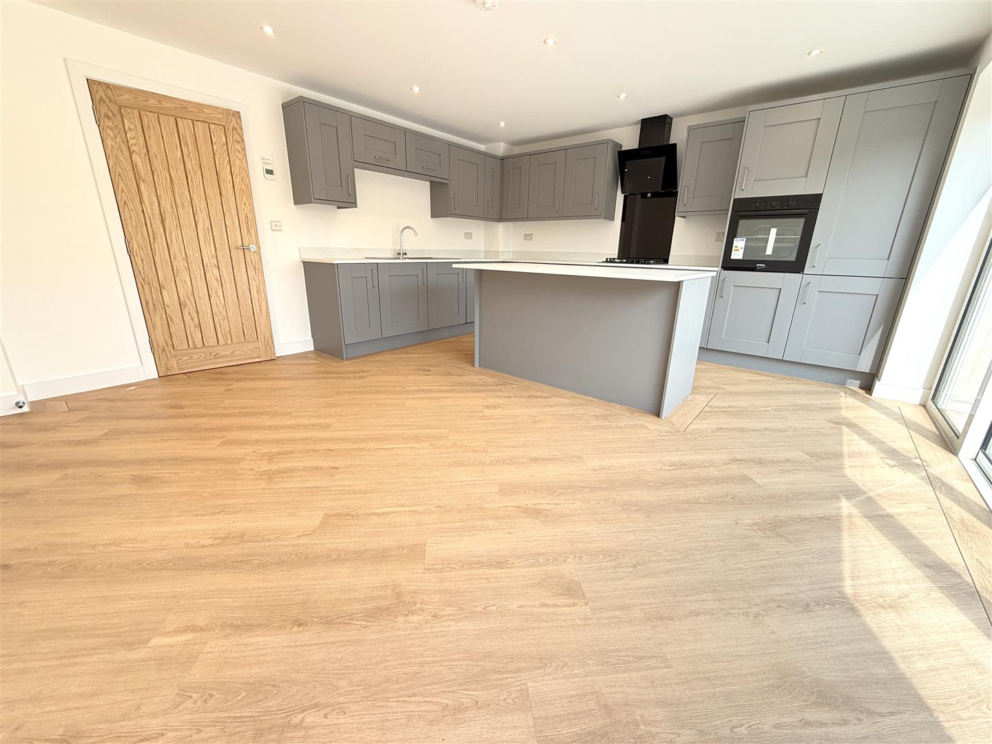 Living/Dining Kitchen - 5.16m x 4.57m (16'11" x 15') - A fantastic feature of the property being of generous proportions, benefitting from a just off southerly aspect to the rear with sliding triple glazed doors leading out onto the rear terrace and garden. The room is large enough to accommodate both a living and dining space which is open plan to a tastefully appointed, fully fitted, kitchen with a generous range of Shaker style wall, base and drawer units with brush metal fittings and finished in heritage style colours offering a superb level of storage, having an L shaped configuration of marble effect work surfaces with inset stainless steel sink and drain unit with chrome swan neck mixer tap. In addition integrated appliances include four ring gas hob with glass splash back and contemporary chimney hood over, fan assisted oven, fridge, freezer, washer drier and dishwasher. The main kitchen units are complemented by a central island unit which provides a good level of additional storage as well as an excellent working area and integral breakfast bar providing informal dining. In addition there is a continuation of the attractive Karndean style flooring, inset downlighters to the ceiling, deep contemporary skirting and triple glazed sliding doors to the rear.
