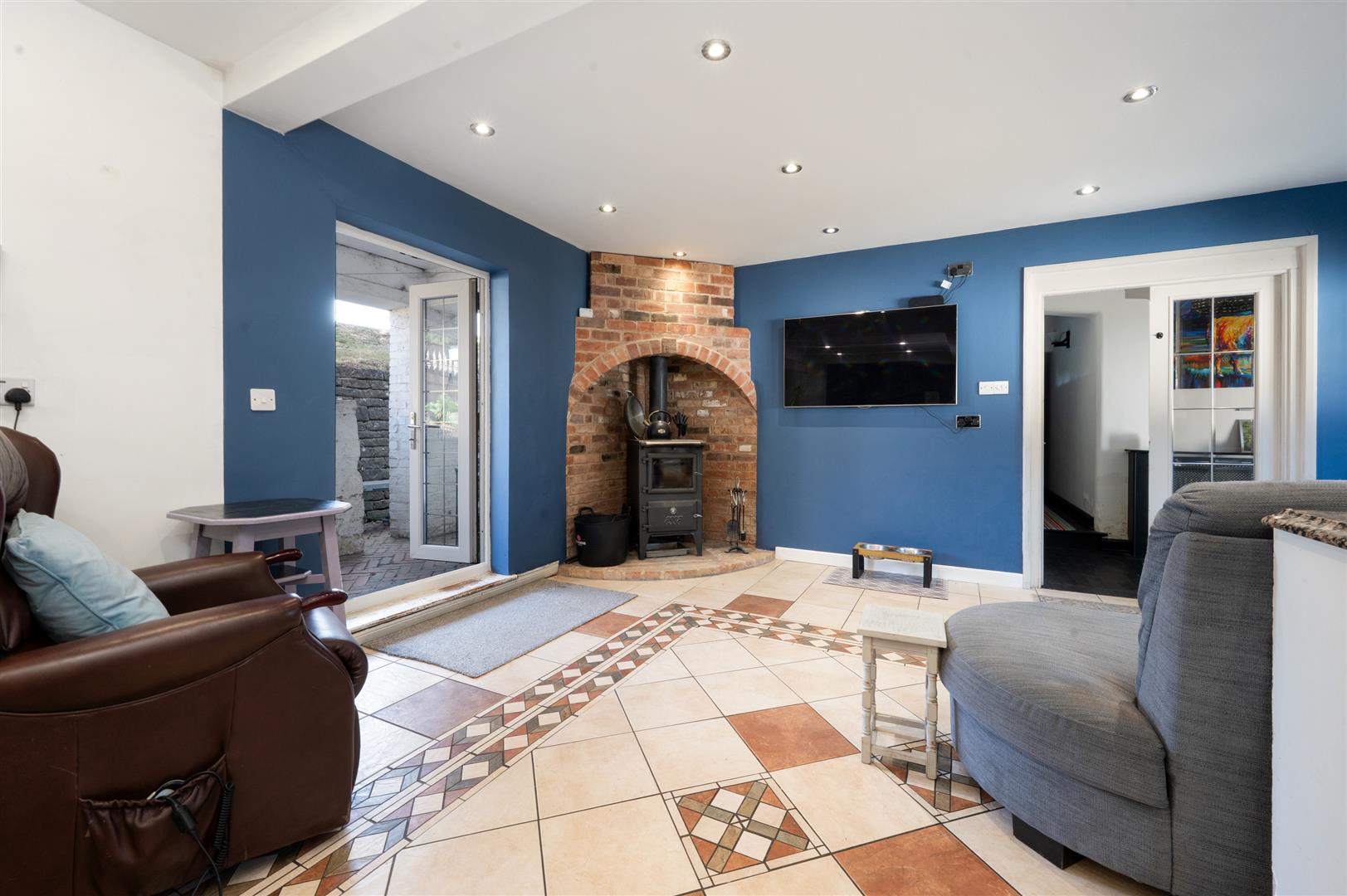 Open Plan Kitchen/Diner - 8.18m max x 4.98m (26'10" max x 16'4") - Having a superb brick built fireplace with modern log burner installed in 2022 mounted on a brick built base. Having base units, granite work surfaces and an under mount twin Belfast sink with oyster mixer tap. Plumbing for a washing machine and space for a tumble dryer and fridge/freezer. There is a freestanding cooking range with six ring electric hob. There are two peninsula islands with granite work surfaces and base units and drawers. Tiled floor, ample ceiling spotlights, double glazed window and French doors to the rear elevation and two double glazed windows to the front elevation.