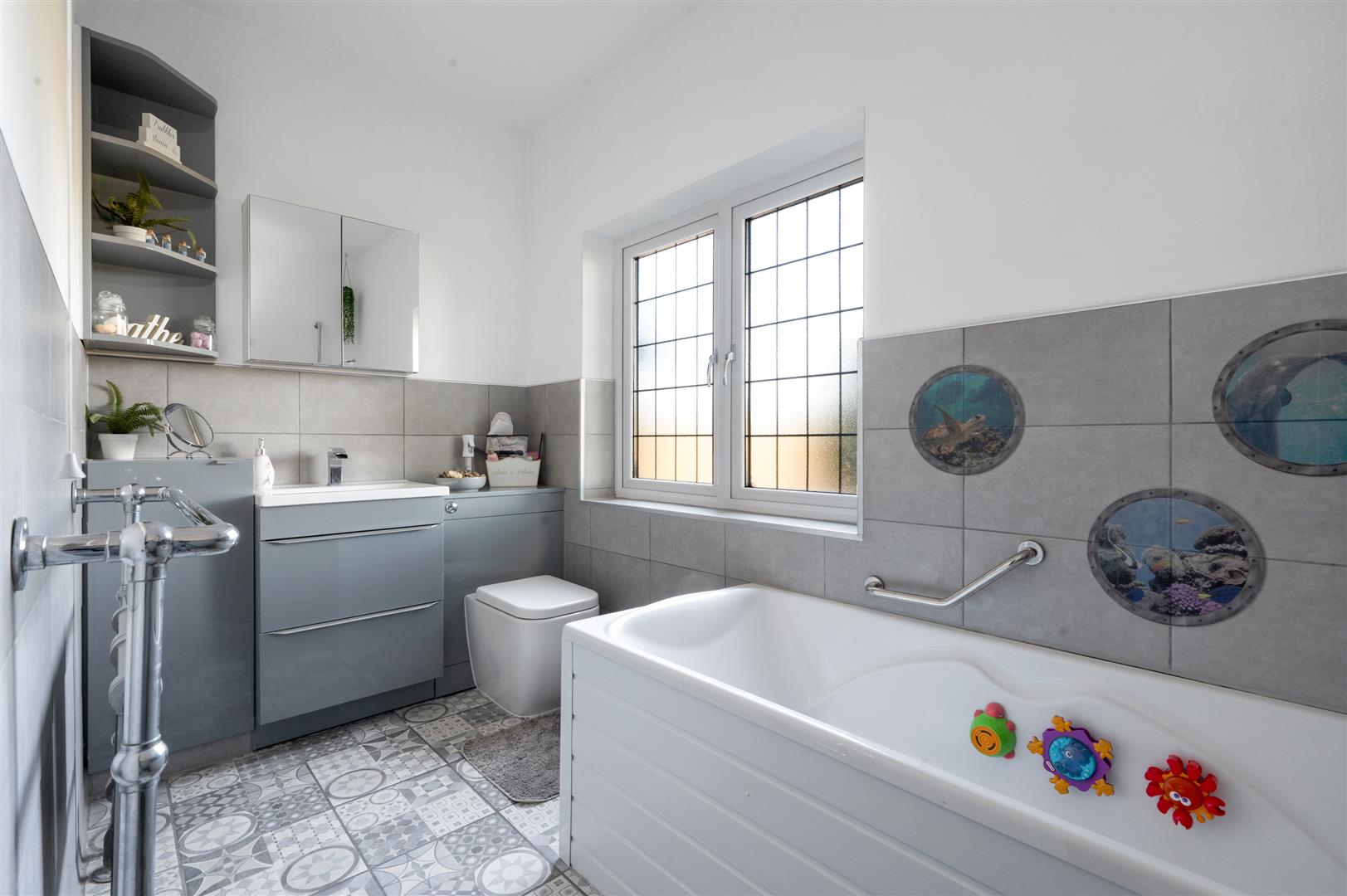 Family Bathroom - 3.18m x 1.63m (10'5" x 5'4") - Having a modern three piece white suite comprising a bathtub with mixer tap and shower handset. Vanity unit with inset wash hand basin with mixer tap and two storage drawers beneath. Low flush WC with enclosed cistern. Tiled floor, part tiled walls, radiator and obscure double glazed window to the rear elevation.