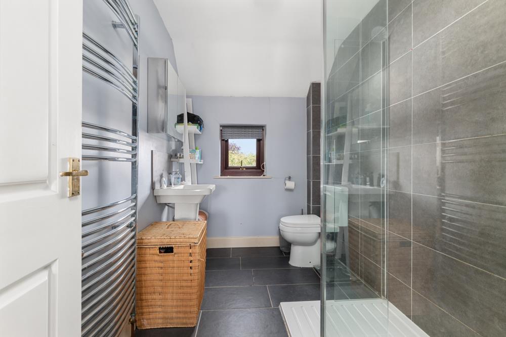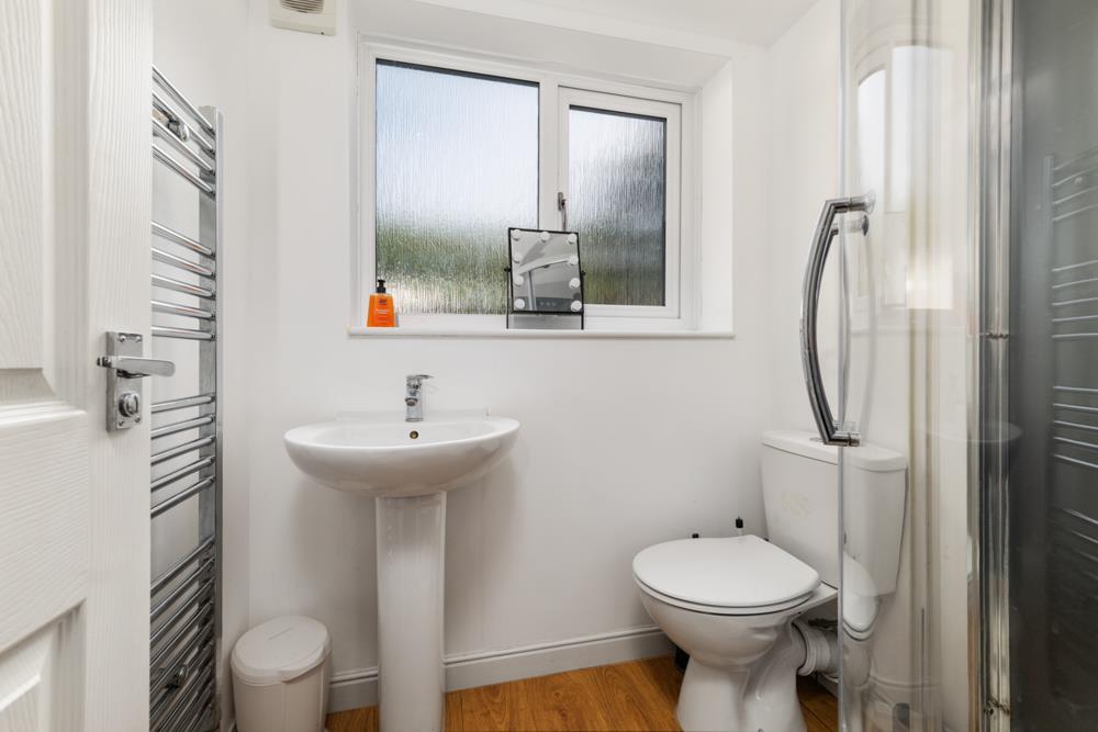 Ensuite Shower Room - 2.90m x 1.75m (9'6" x 5'9") - Having a suite comprising double width shower enclosure with initial drying area, wall mounted shower mixer with both independent handset and rainwater rose over, close coupled WC and pedestal washbasin with chrome mixer tap and tiled splash backs, chrome towel radiator and double glazed window to the front.