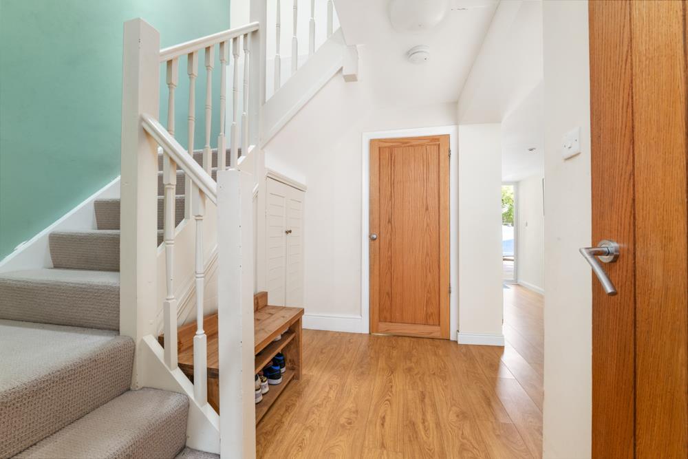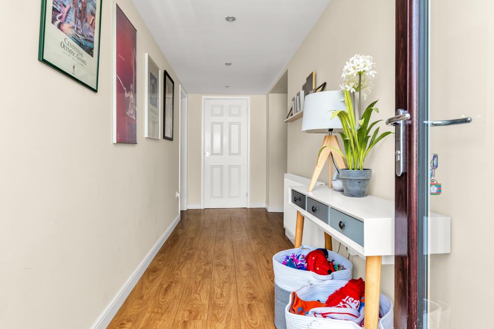 Initial Entrance Hall - 5.38m x 1.42m (17'8" x 4'8") - A relatively well proportioned entrance hall having wood effect laminate flooring, deep skirtings, inset downlighters to the ceiling, initial exposed brick pier, built in cloaks cupboard providing useful storage and, in turn, further doors leading to: