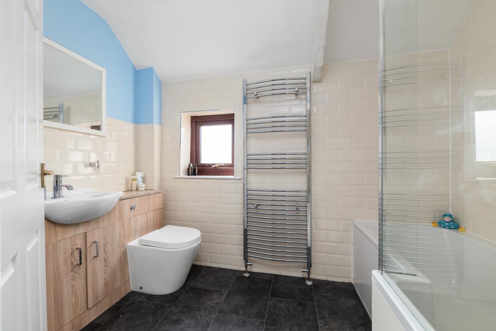 Bathroom - 2.74m x 1.65m (9' x 5'5") - Having a suite comprising P shaped shower bath with chrome mixer tap, wall mounted shower mixer with independent handset over and glass screen, WC with concealed cistern and washbasin with chrome mixer tap and tiled splash backs, contemporary towel radiator and double glazed window.