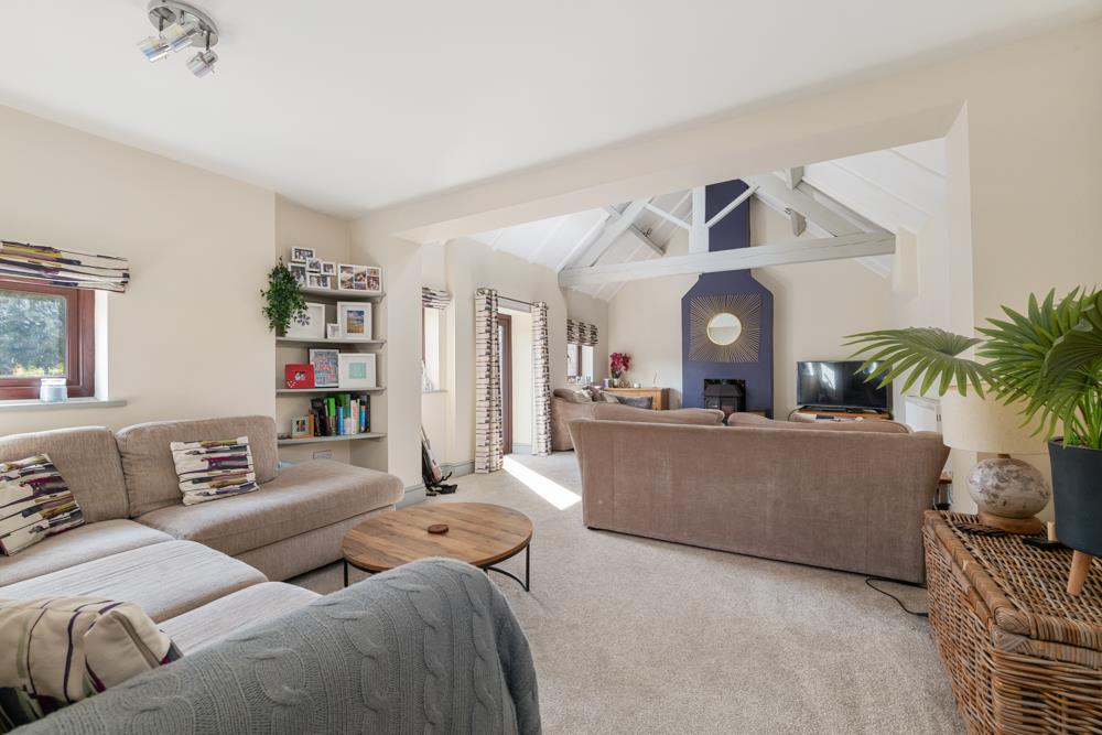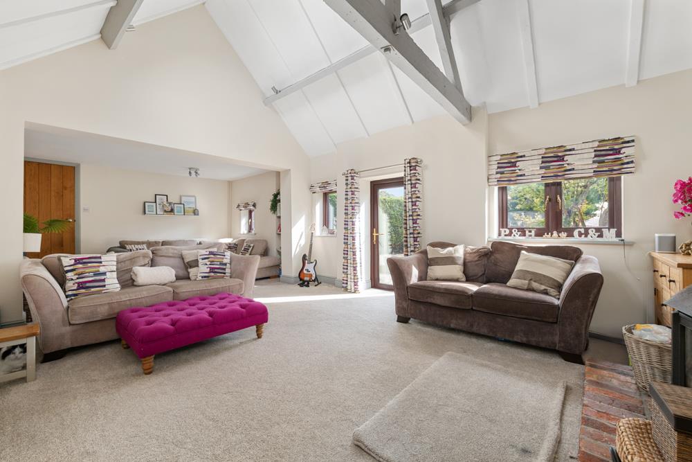Sitting Room - 8.10m x 4.14m (26'7" x 13'7") - An attractive, light and airy room with a wealth of character, having part vaulted ceiling with exposed king post, truss and purlin, the focal point to the room being chimney breast with raised brick hearth, inset solid fuel stove and alcoves to the side, deep skirtings, double glazed windows and exterior door to the side and inset skylights to the ceiling.