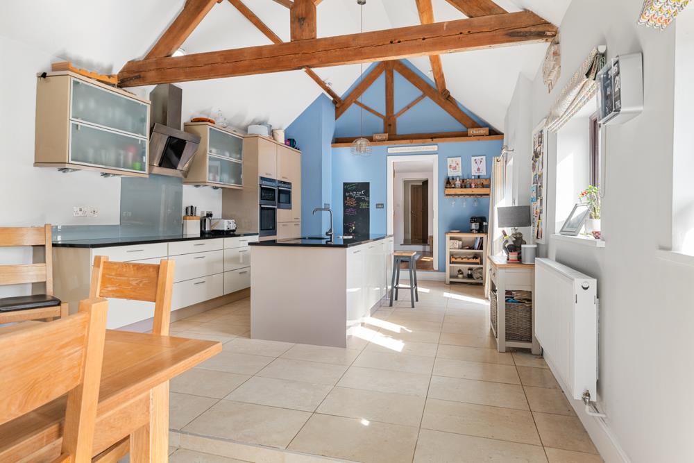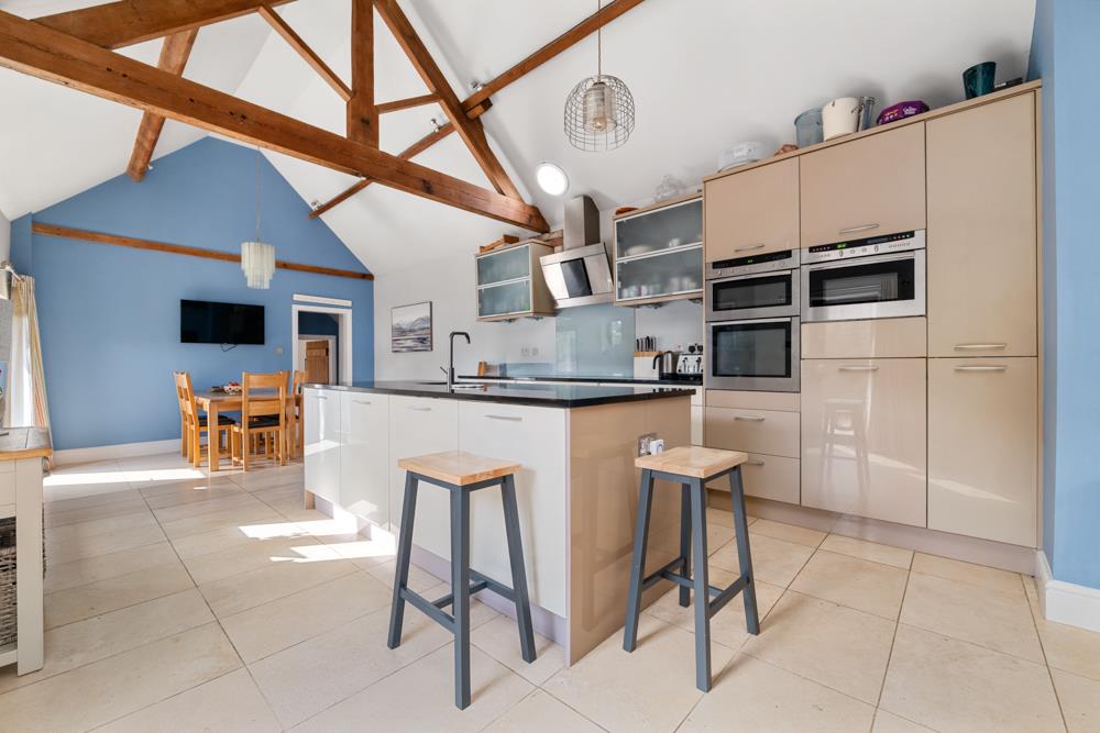 Open Plan Living/Dining Kitchen - 8.33m x 4.17m (27'4" x 13'8") - A fantastic space of generous proportions, affording immense character, having attractive high vaulted ceiling with exposed central king post and truss and timber purlins. The initial kitchen area is appointed with a generous range of contemporary wall, base and drawer units with brush metal fittings providing an excellent level of storage, having two runs of granite preparation surfaces including a central island unit with undermounted sink and mixer tap, integrated appliances including Neff double oven, microwave, dishwasher and Neff induction hob with contemporary hood over and attractive Travertine style flooring which leads through into a dining/living space. This space, again, has a vaulted ceiling and exposed timbers and also having double glazed windows and exterior door into the garden.