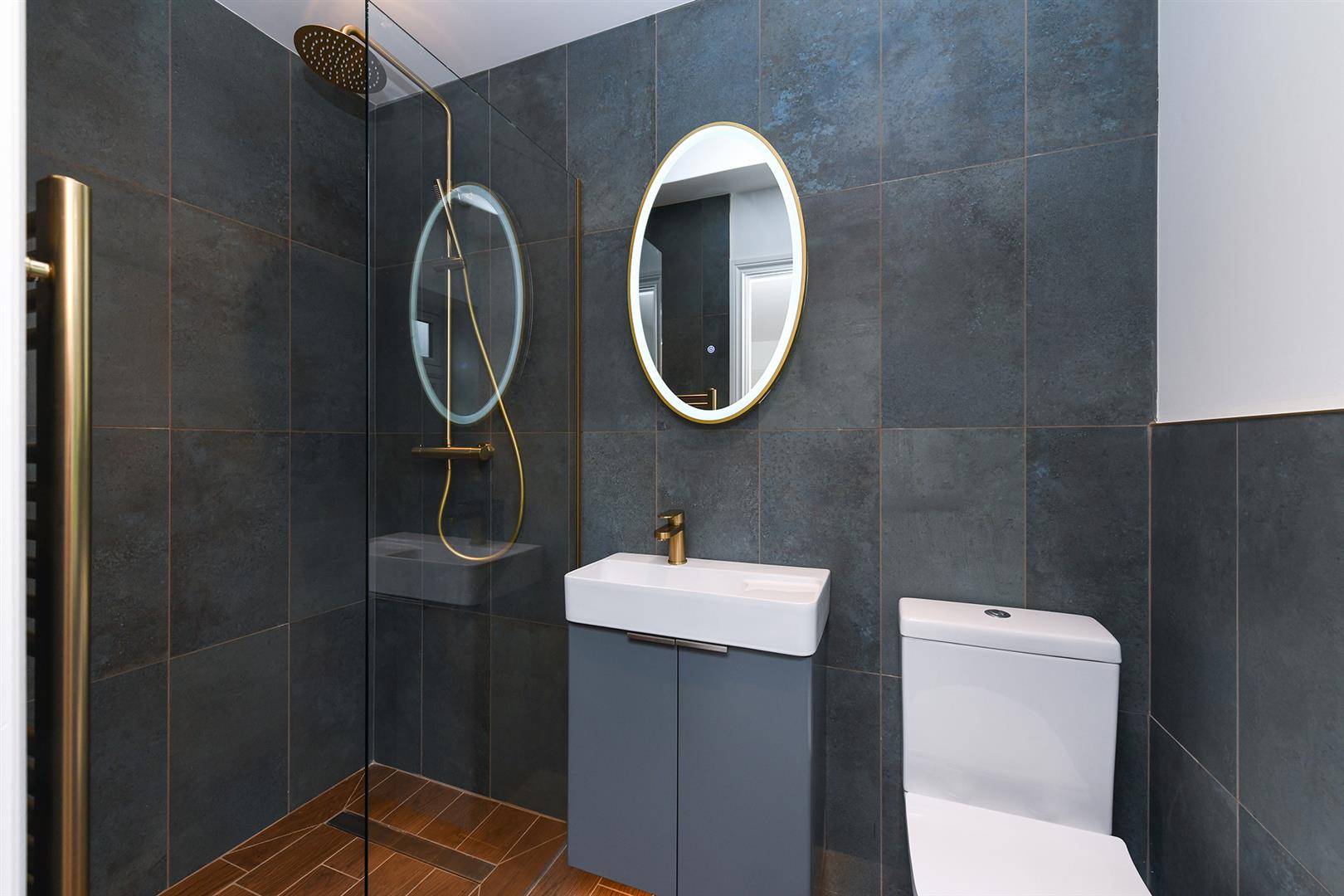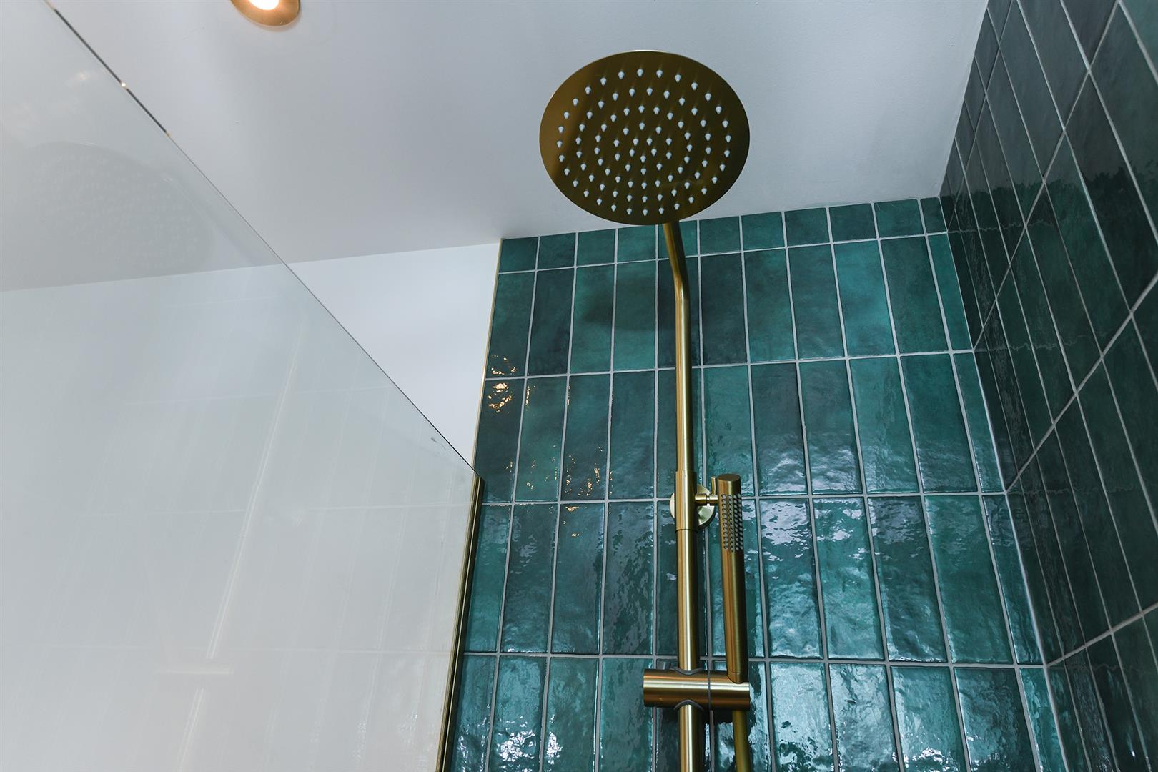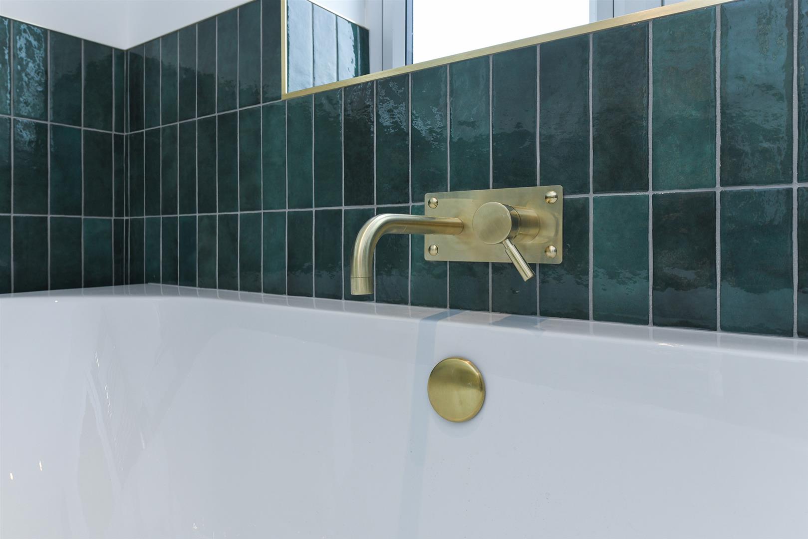 Family Bathroom - A superbly finished four piece family bathroom including a deep fill dual ended bath with central mixer tap in gold finish. There is a floating vanity wash basin with storage drawers and a countertop basin with mixer tap in gold tone finish. A dual flush back-to-wall toilet and a walk-in shower enclosure with glazed fixed screen and mains fed rainfall shower with additional spray hose. Timber effect tiling to the floor, attractive emerald green tiling to the walls for splashbacks, spotlights and extractor fan to the ceiling, a uPVC double glazed obscured window to the rear aspect and a large gold finish towel radiator.