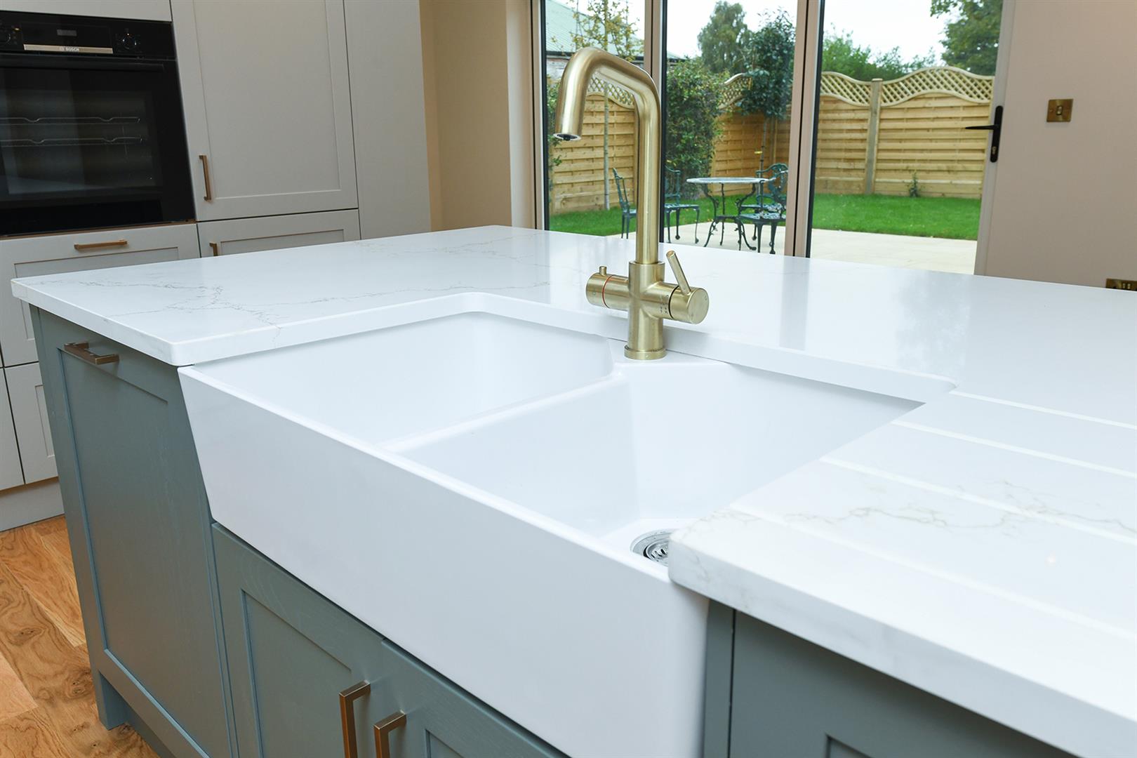 The kitchen area is superbly appointed with an extensive range of quality Shaker-style base and wall units in Taupe and Willow, finished with luxurious granite worktops, matching upstands, and splashbacks. A generous island unit provides ample storage and features an inset twin-bowl Butler's sink with gold-tone boiling hot water tap and drainer grooves to the side.