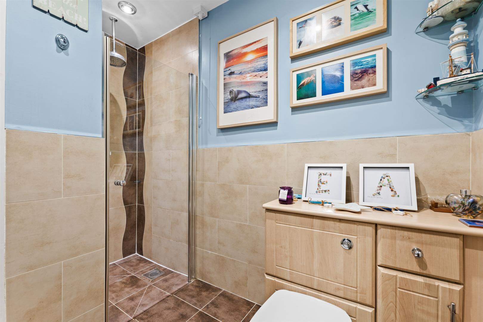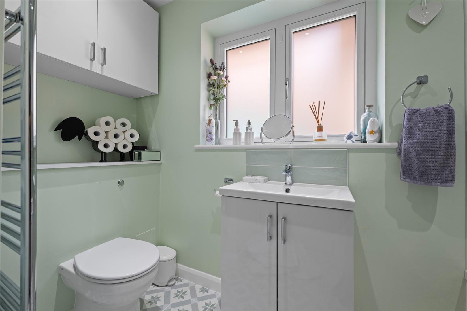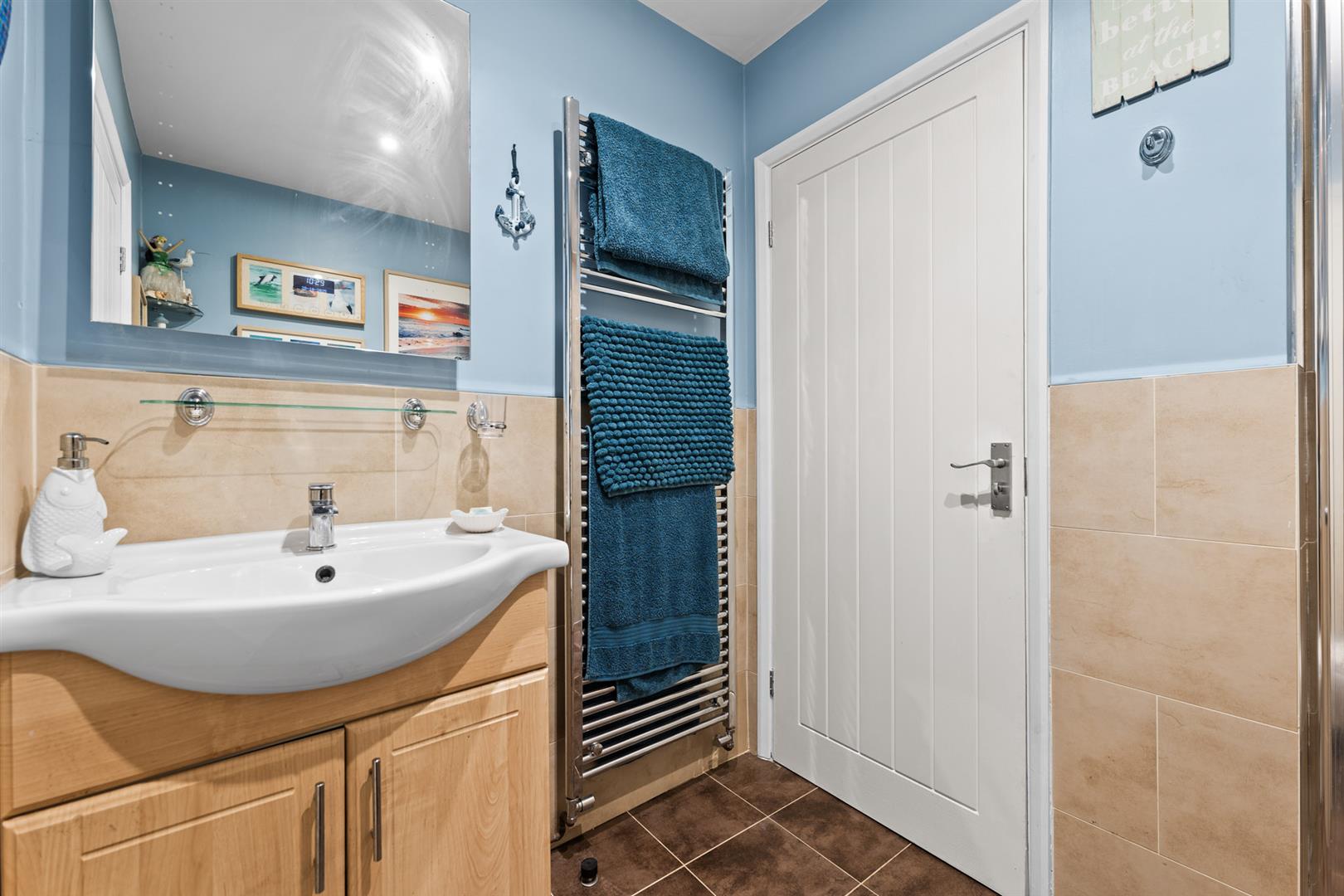 Jack N' Jill L Shaped Shower Room - 2.64m max x 2.06m max (8'8" max x 6'9" max) - Linking back into the inner hallway and could be utilised as a cloaks area, shower room for guests or ensuite facilities for Bedroom 2. The room is appointed with a modern suite comprising shower enclosure with wall mounted mixer and rose over, vanity unit with WC with concealed cistern and a further separate vanity unit with inset washbasin with chrome mixer tap and tiled splash backs and contemporary towel radiator.