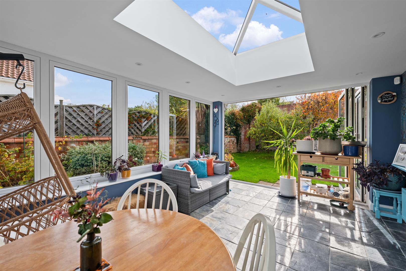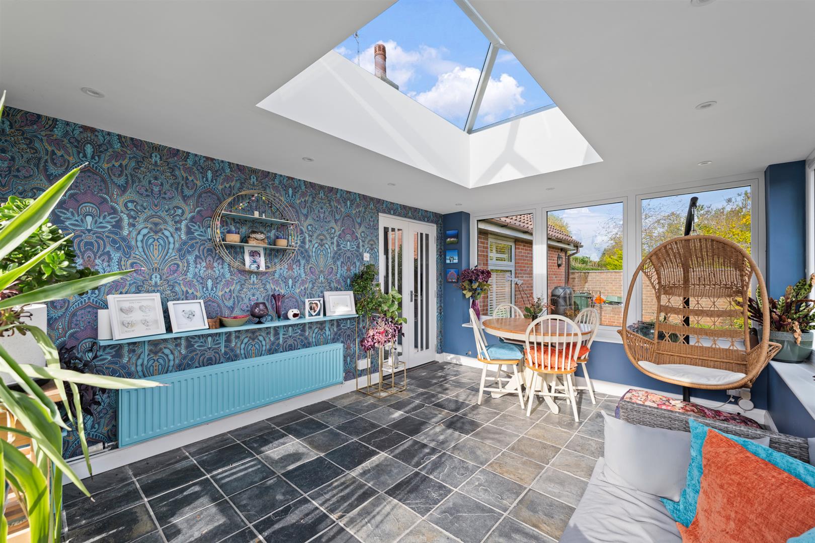 Garden Room - 4.39m x 3.56m (14'5" x 11'8") - A well proportioned reception flooded with light, benefitting from double glazed windows to two elevations as well as bifold doors at the rear and central clear glass sky lantern. The room is perfect as an additional sitting room, having a slated tiled floor and inset downlighters to the ceiling, providing an extra sitting/dining space with pleasant aspects.