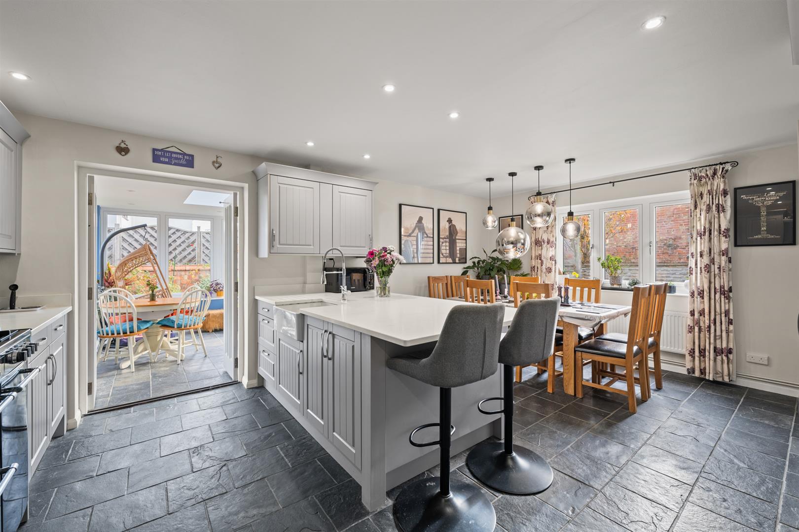 Dining Kitchen - 5.84m x 4.09m (19'2" x 13'5") - A fantastic, well proportioned, open plan space which benefits from a dual aspect having double glazed window into the rear garden and French doors into the garden room at the side. The kitchen is large enough to accommodate both a living and dining space, being open plan to a well appointed kitchen with a considerable range of integrated wall and base units with hand painted door fronts and generous runs of quartz preparation surfaces, including a central peninsula unit with integral breakfast bar providing an informal dining space as well as a fantastic working area, ideal for the keen cook, having an integrated Villeroy & Boch ceramic sink with articulated mixer tap. The kitchen having space for a free standing range with splash back and chimney hood over, room for a free standing fridge freezer, a built in larder unit, a shelved dresser unit, inset downlighters to the ceiling and an attractive slate tiled floor.