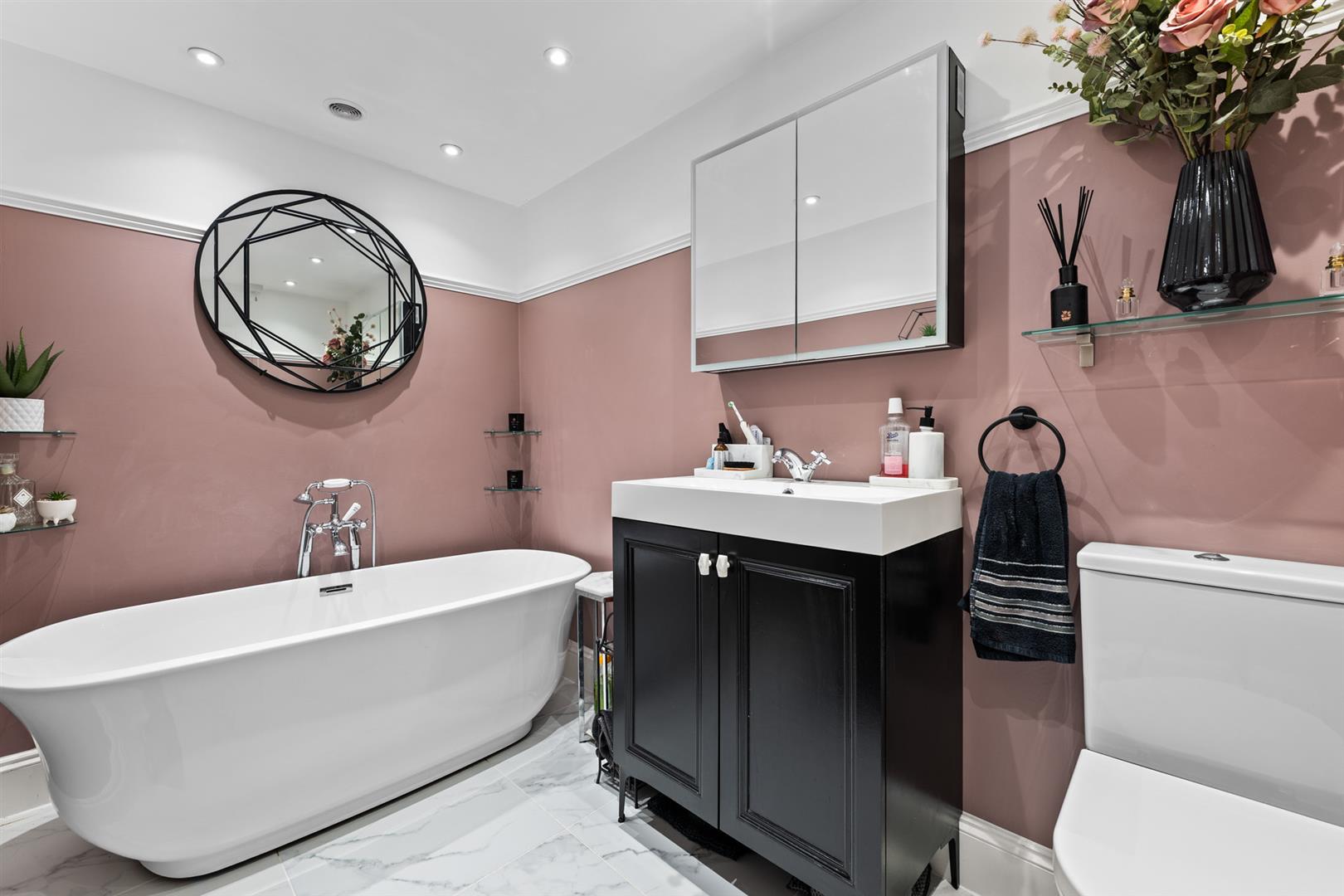 Ensuite Bathroom - 3.02m x 1.78m (9'11" x 5'10") - Having a modern suite with a traditional slant, comprising double ended free standing bath with mixer tap and integral shower handset, close coupled WC and vanity unit with inset moulded washbasin with chrome mixer tap, traditional style column radiator, picture rail, inset downlighters to the ceiling and attractive marble effect tiled floor.