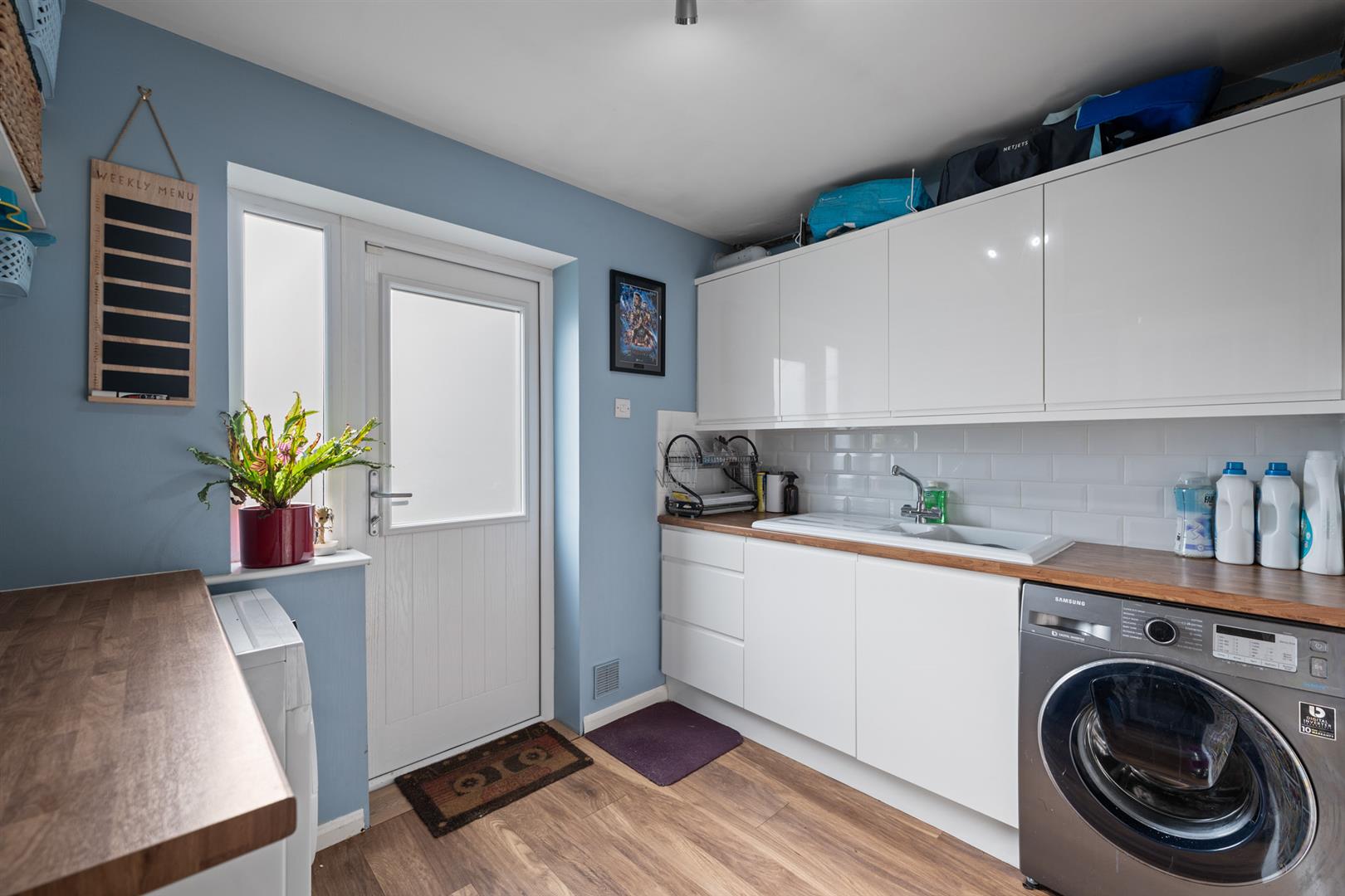 Utility - 2.13m x 2.90m (7' x 9'6") - A useful space fitted with wall, base and drawer units with contemporary gloss fronted doors, butchers block effect work surface with inset ceramic sink and drain unit with chrome mixer tap and metro style tiled splash backs, oak effect flooring, plumbing for washing machine, space for further free standing appliances and composite double glazed exterior door into the garden.