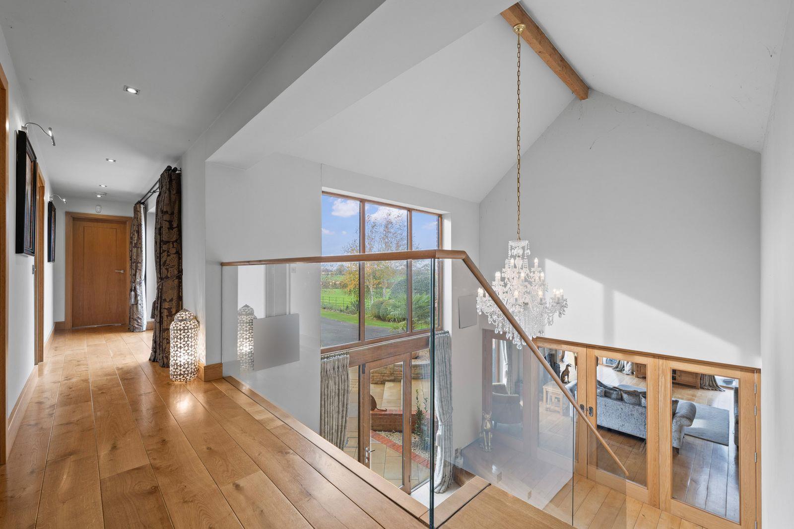 First Floor Galleried Landing - Having an aspect into the vaulted ceiling as well as through the glazed full height opening which affords wonderful views across adjacent fields. The landing has attractive wide board oak flooring, deep skirtings and architrave, timber glazed double glazed lights, central single French door and Juliet balcony affording wonderful panoramic views and, in turn, further contemporary doors leading to: