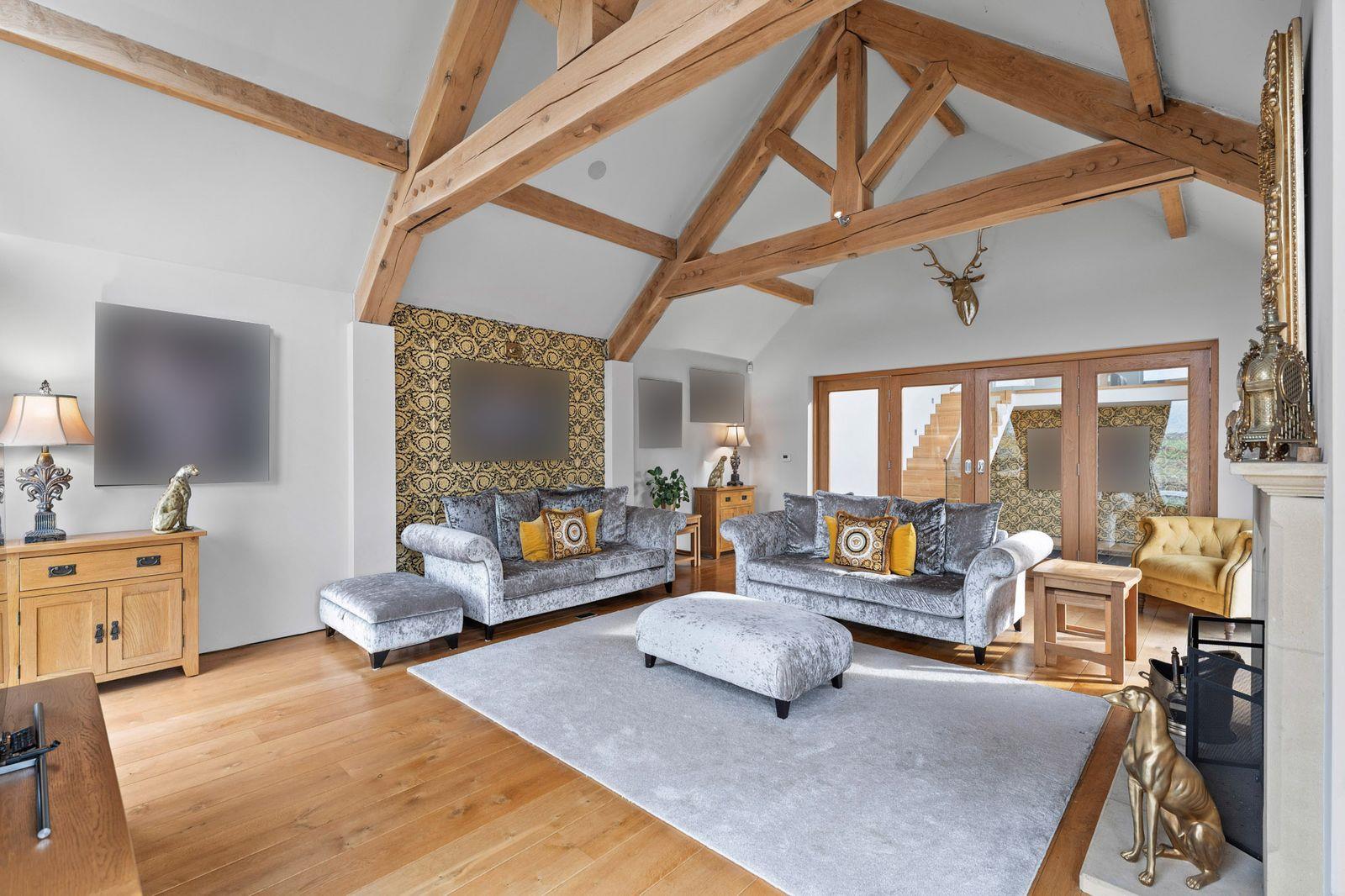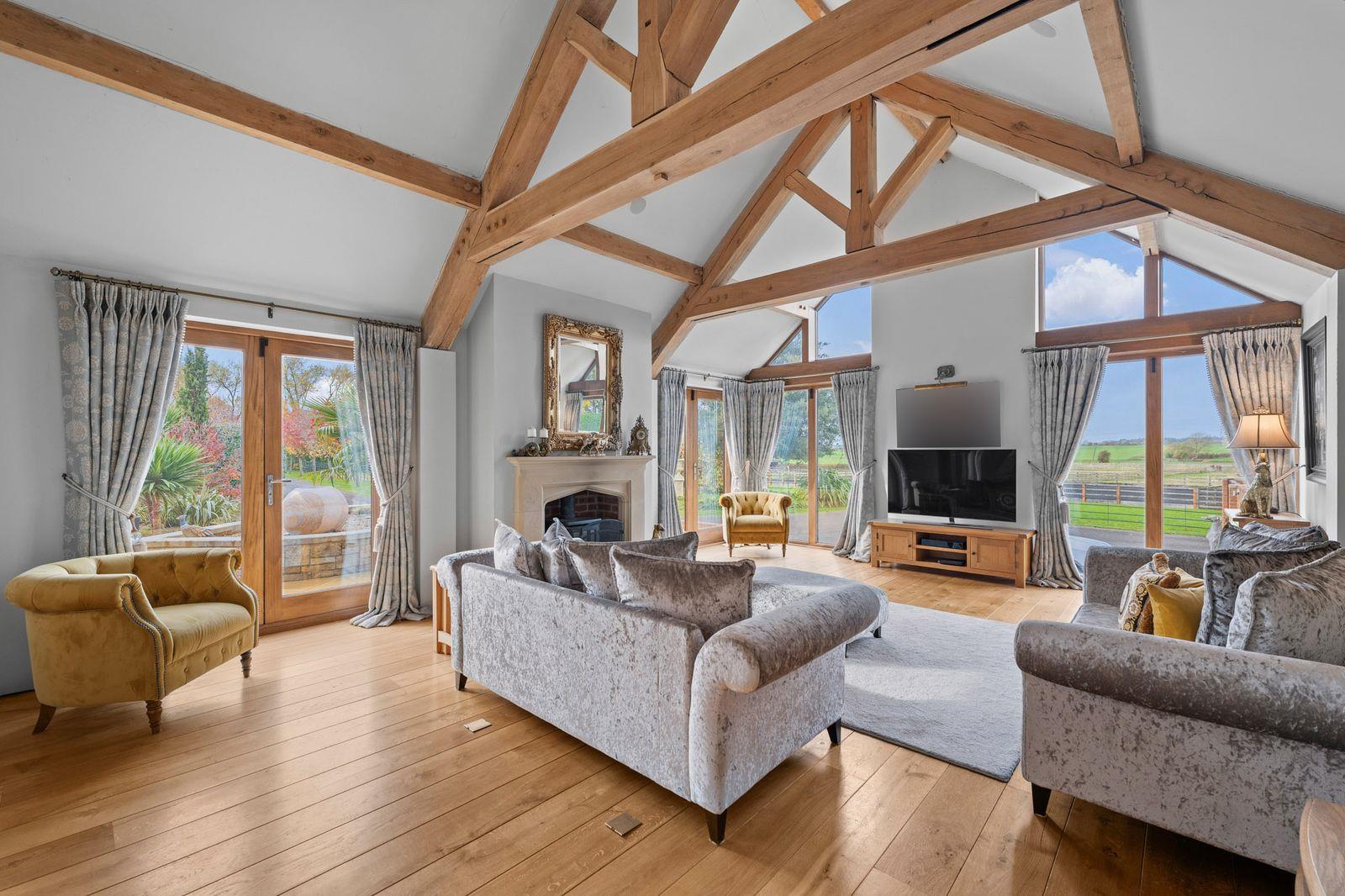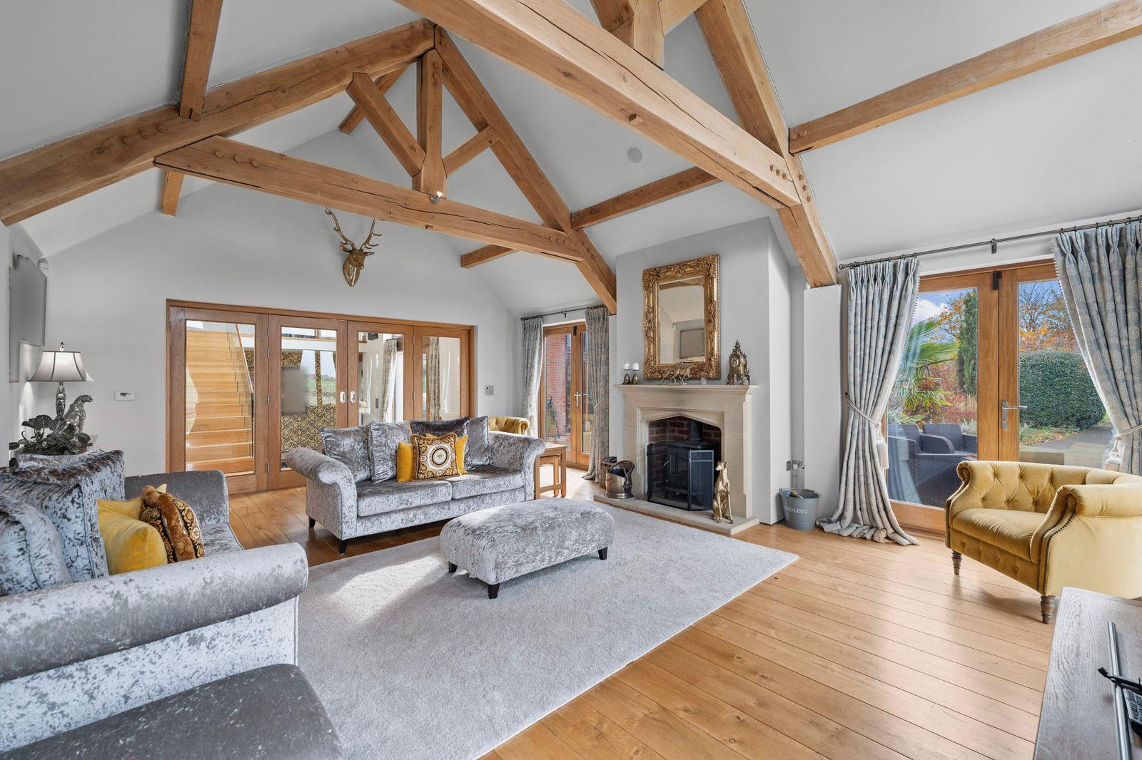The heart of the home will undoubtedly be the stunning dining kitchen with a part vaulted ceiling and windows to three elevations which is beautifully appointed, being fitted with a bespoke handcrafted range of units by Loxleys to incorporate both traditional and contemporary elements. The kitchen is fitted with high quality integrated appliances including a sub zero fridge freezer and wine cooler and Miele oven and hob complemented with a traditional style electric Aga range. This room offers wonderful views into the garden, linking out onto a south to westerly facing terrace with views across the garden. The main sitting is again a truly superb space with exposed oak timbers and a high vaulted ceiling with king post and truss, a glazed gable end and wonderful views down the property's own gardens and fields beyond.