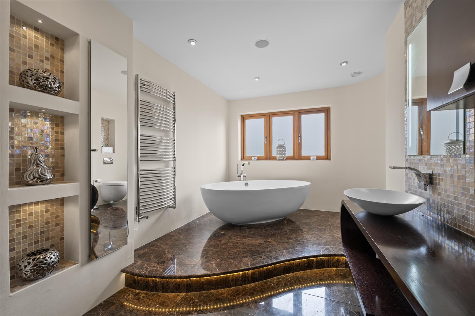 Bathroom - 4.14m x 2.67m max (13'7" x 8'9" max ) - A well proportioned family bathroom beautifully appointed with a contemporary suite comprising; impressive free standing elliptical bath with floor standing mixer tap with integral shower handset; wall hung WC; vanity unit with elliptical washbasin, wall mounted mixer tap, mosaic tiled splash backs with integrated mirror; polished stone floor; contemporary towel radiator; and obscured double glazed window.