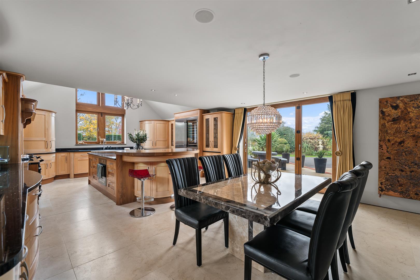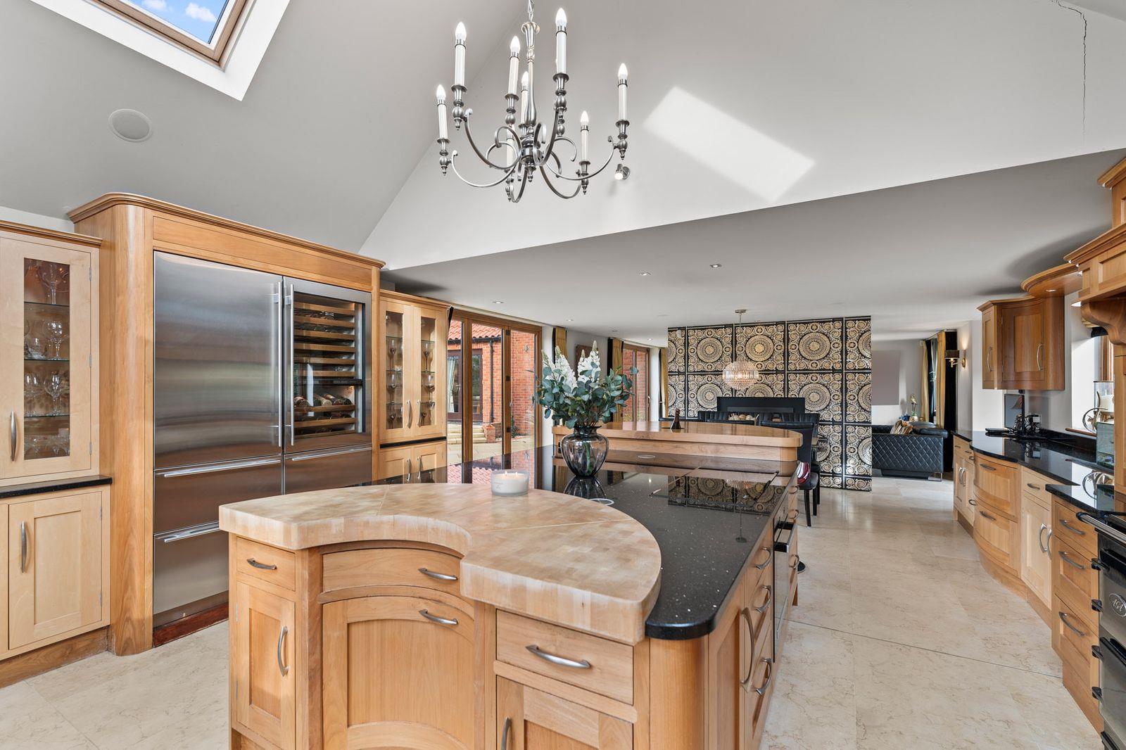 Dining Kitchen - 8.43m x 5.61m (27'8" x 18'5") - A particularly impressive space which will undoubtedly become the hub of the home, benefitting from windows to three elevations and includes a part vaulted ceiling with inset sky lights providing a wonderful, light and airy space the focal point of which is the double sized chimney breast with inset contemporary stove. The kitchen is beautifully appointed with a handcrafted Loxley kitchen comprising a considerable range of bespoke units with glazed display cabinets and a central island unit with granite preparation surfaces providing a fantastic working area; an additional breakfast bar with integrated wine cooler; further appliances including Miele fan assisted oven and induction hob, Aga electric range, dishwasher, sub zero fridge freezer and integrated wine cooler; undermounted stainless steel twin bowel sink with brush metal swan neck Franke mixer tap; continuation of the tiled floor; bifold doors leading out onto the terrace and two further windows to the rear and side elevations.