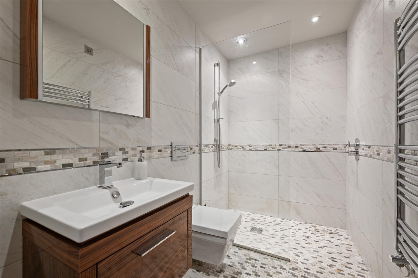 Ensuite Shower Room - 2.82m x 1.47m (9'3" x 4'10") - Having a contemporary suite comprising; WC with concealed cistern; vanity unit with inset washbasin and chrome mixer tap; walk in shower wet area with glass screen and wall mounted shower mixer; tiled splash backs with mosaic border inlay; contemporary towel radiator; and mosaic tiled floor with underfloor heating.