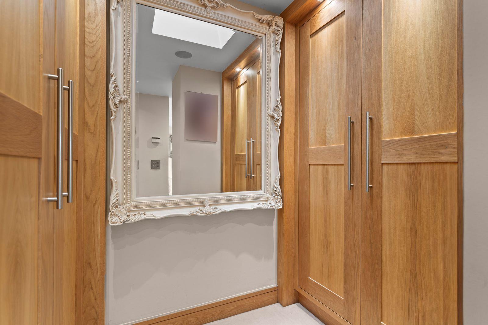 Walk In Dressing Room - Tastefully appointed with integrated furniture comprising full height wardrobes and storage shelves with oak door fronts, the room having inset downlighters and sky light to the ceiling.