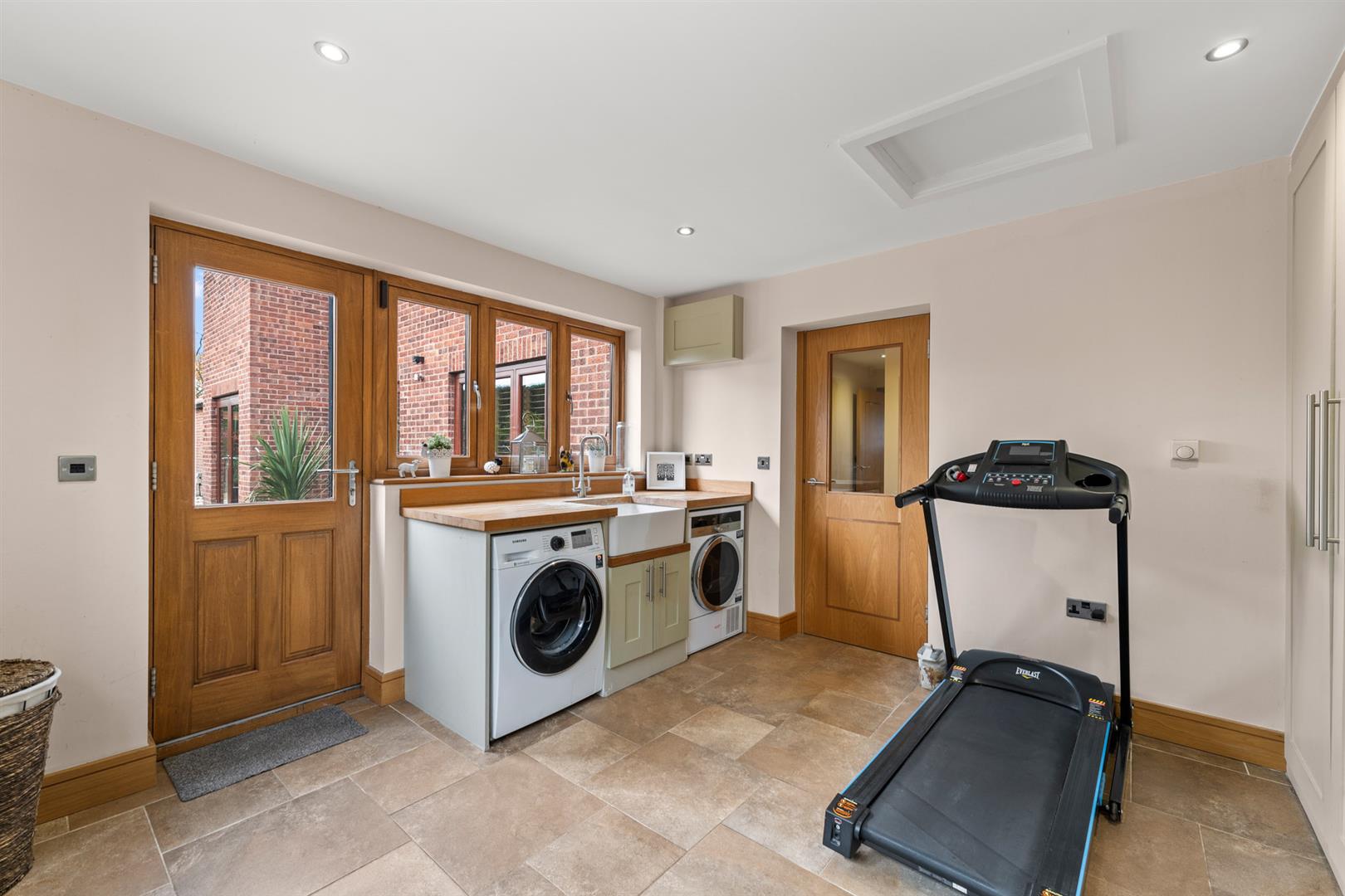 Utility Room - 3.63m into cupboards x 3.45m (11'11" into cupboard - A well proportioned and useful space having a good level of storage with integrated full height cupboards, additional low level cupboard unit, ceramic sink with oak surround and brush metal mixer tap, plumbing for washing machine, space for tumble dryer, continuation of the tiled floor, double glazed windows to two elevations and exterior door.