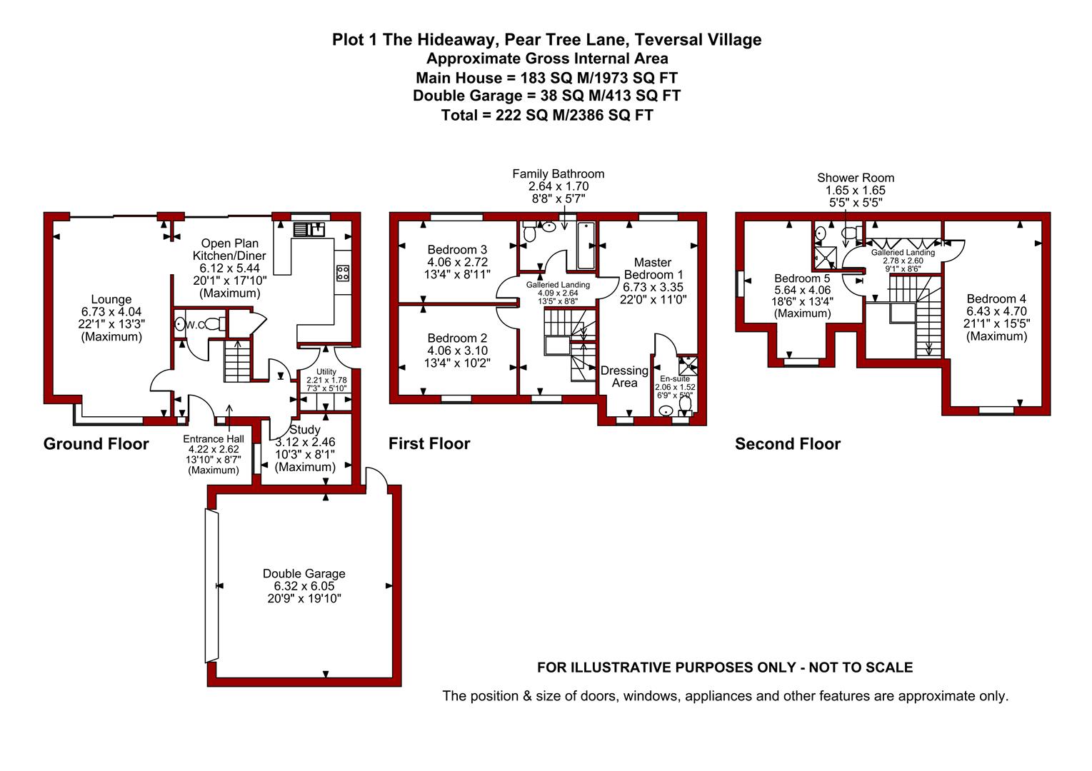 Plot 1 The Hideaway layout of living accommodation comprises an entrance hall with bespoke oak and glass staircase rising all the way up to the first and second floor galleried landings, downstairs WC, study, spacious 22ft dual aspect lounge, open plan kitchen/diner and a utility which comes with a washing machine and a separate tumble dryer. The first floor galleried landing leads to a large master bedroom with dressing area and an en suite. There are two further double bedrooms on the first floor as well as a family bathroom. The second floor galleried landing leads to bedroom four and five and a separate shower room.