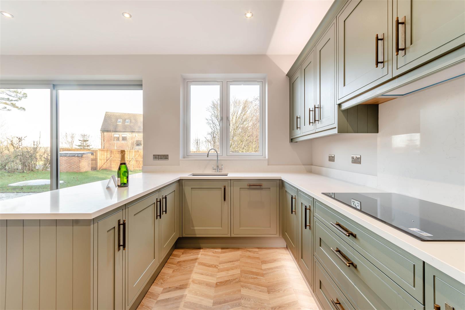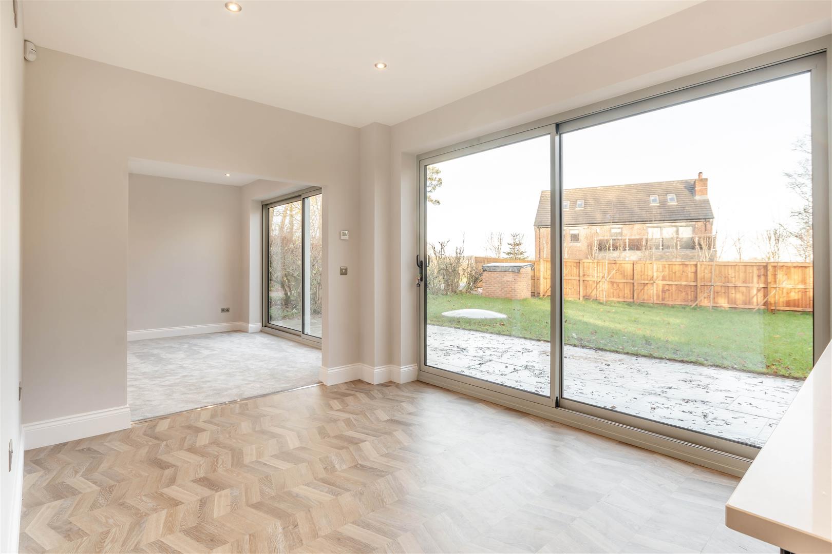 Open Plan Kitchen/Diner - 6.12m x 5.44m max (20'1" x 17'10" max) - (9'5" into dining area). A superbly appointed open plan kitchen/diner, having a range of contemporary shaker cabinets comprising wall cupboards, base units and drawers complemented by quartz work surfaces and matching upstands. Under mount 1 1/2 bowl sink with chrome swan-neck mixer tap. There is a peninsula island with space for stools underneath. Integrated Bosch cooking appliances include a single electric oven, separate combination microwave oven, five ring induction hob and extractor hood above. Further integrated appliances include a fridge/freezer, dishwasher and wine cooler. Herringbone LVT flooring, underfloor heating, eleven ceiling spotlights, eight double power points, double glazed window to the rear elevation and large double glazed aluminium sliding patio door leading out onto the rear garden. A built-in understairs storage cupboard with LVT herringbone floor and underfloor heating manifold provides useful storage.