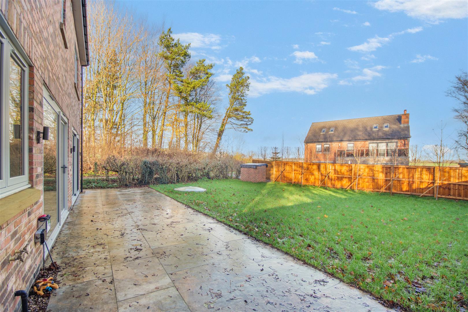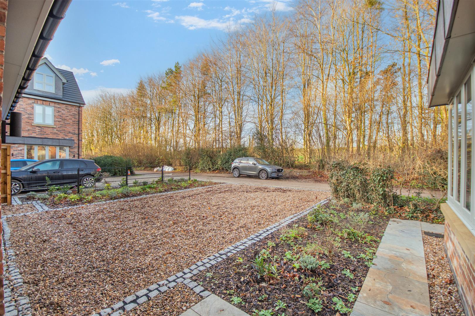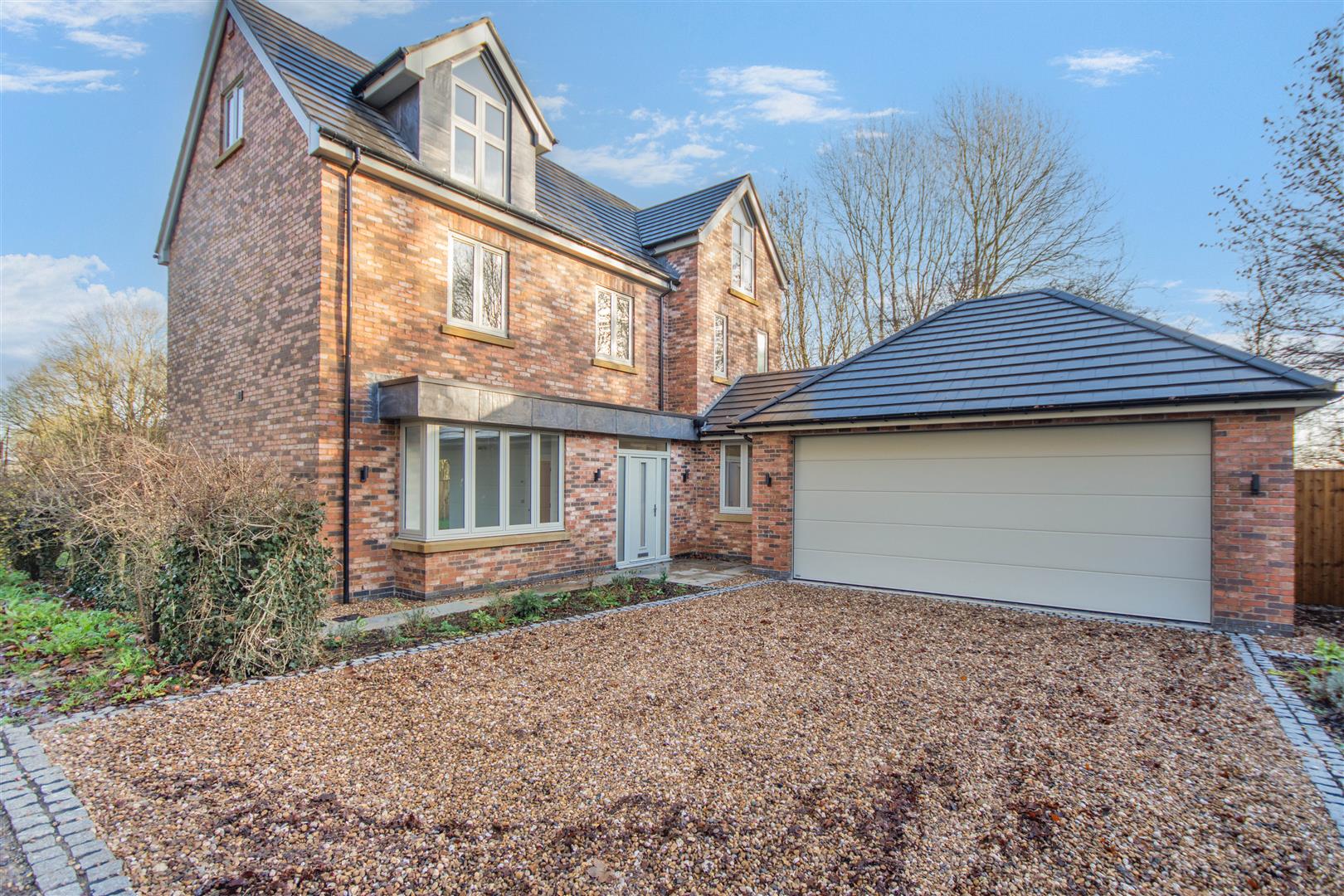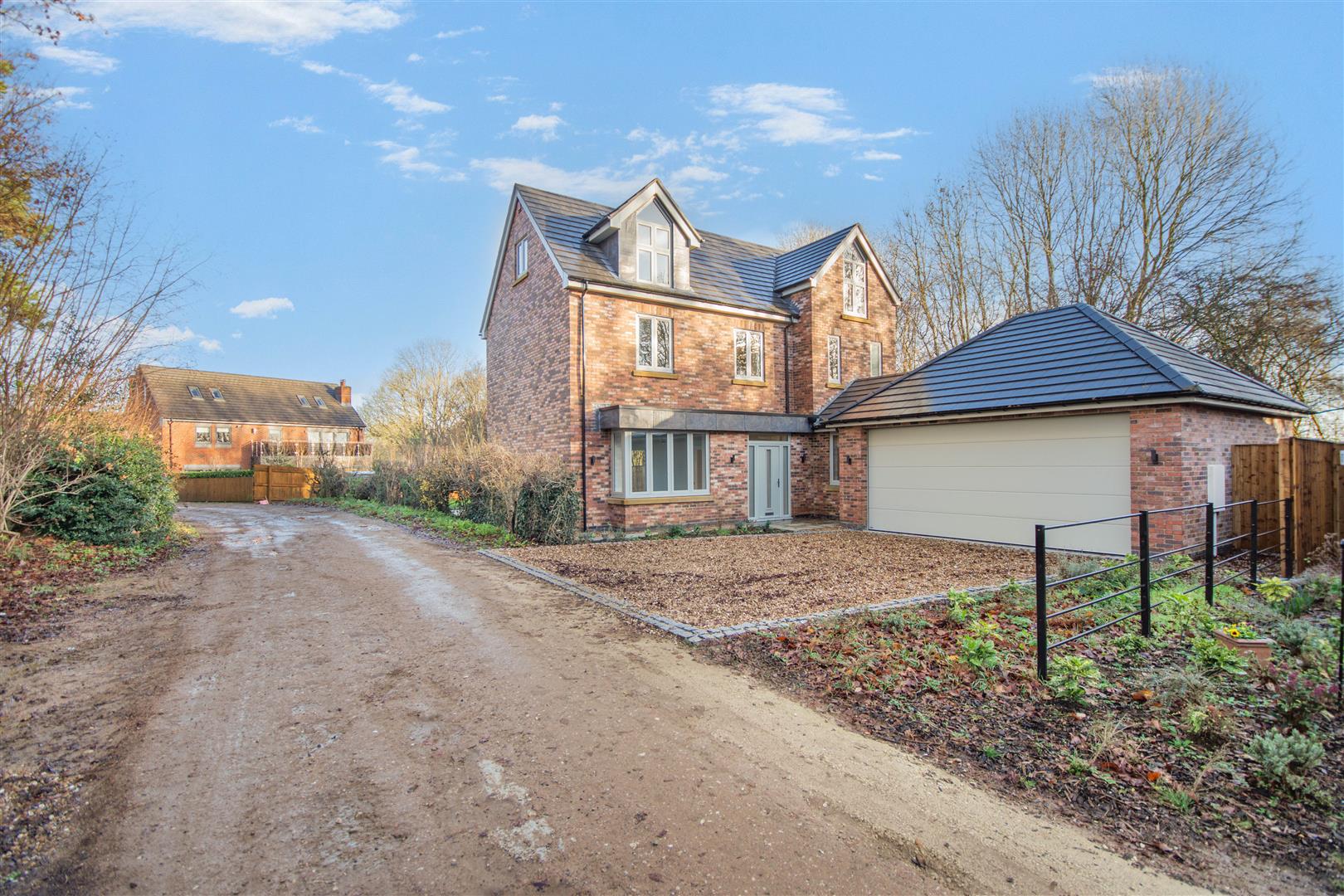 Outside - Pear Tree Lane is a countryside lane accessed from the centre of Teversal Village off Pleasley Road. The approach alongside adjacent countryside with wonderful views continue when you get to the property, which really do emphasise the quiet, rural village setting. Externally, plot 1 has a double width pebble driveway frontage which leads to a large attached double garage with a remote controlled electric up and over door. There are borders to each side of the driveway with an attractive sandstone pathway across the front and down the side of the property leading to the rear garden. There is also gated access to the right hand side of the garage giving access behind the garage and to the other side of the property which leads round to the rear. To the rear of the property, there is an extensive sandstone patio which extends across the full width of the property. Beyond here, there is a lawn, Kingspan Klargester BioDisc, fenced boundaries on two sides with planted trees in front and a hedgerow boundary to the other side.