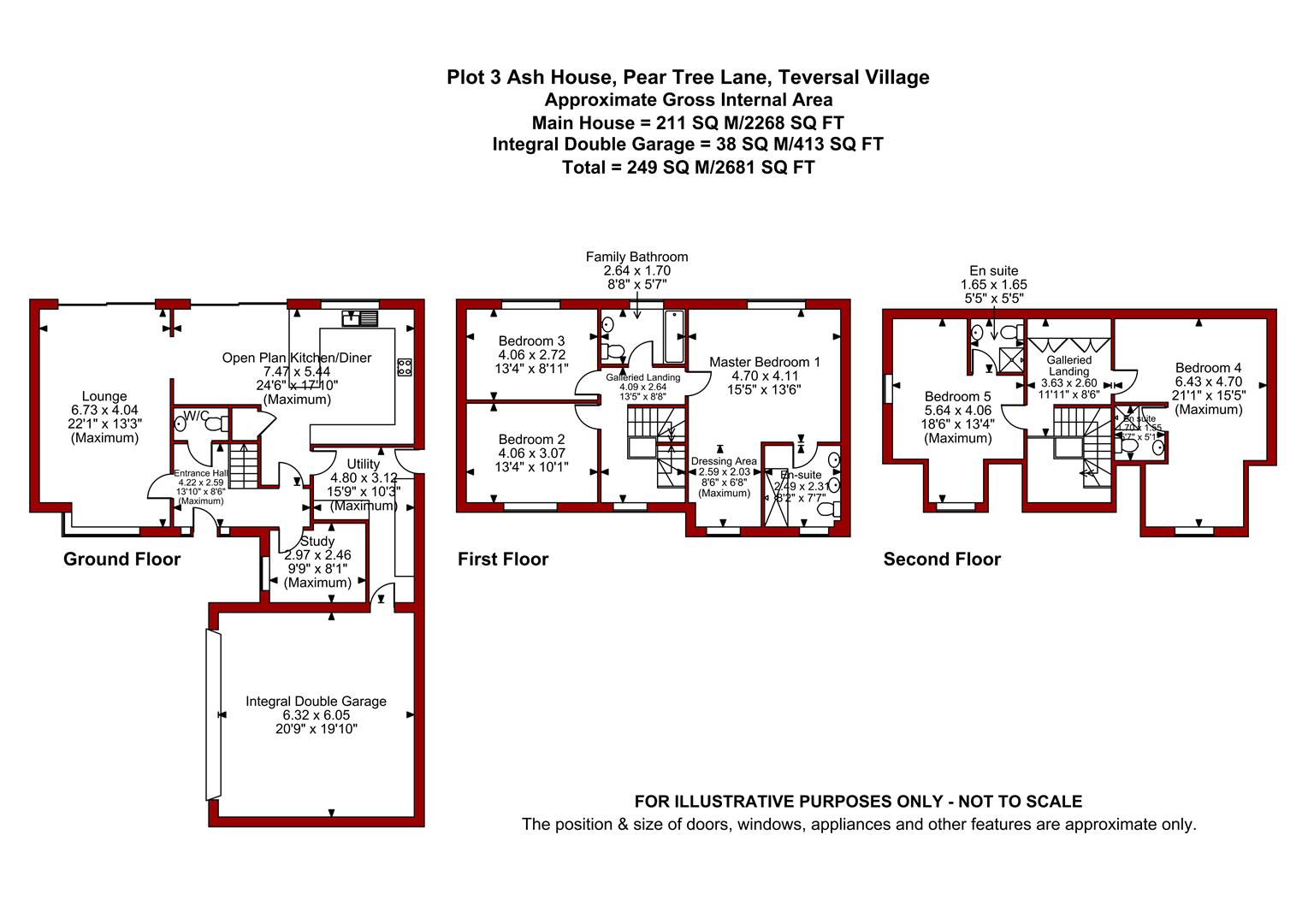 Plot 3 Ash House layout of living accommodation comprises an entrance hall with bespoke oak and glass staircase rising all the way up to the first and second floor galleried landings, downstairs WC, study, spacious 22ft dual aspect lounge, open plan kitchen/diner and a good sized L-shaped utility which comes with a washing machine and a separate tumble dryer. The first floor galleried landing leads to a large master bedroom with dressing area and an en suite. There are two further double bedrooms on the first floor as well as a family bathroom. The second floor galleried landing leads to bedroom four and five each with its own en suite.