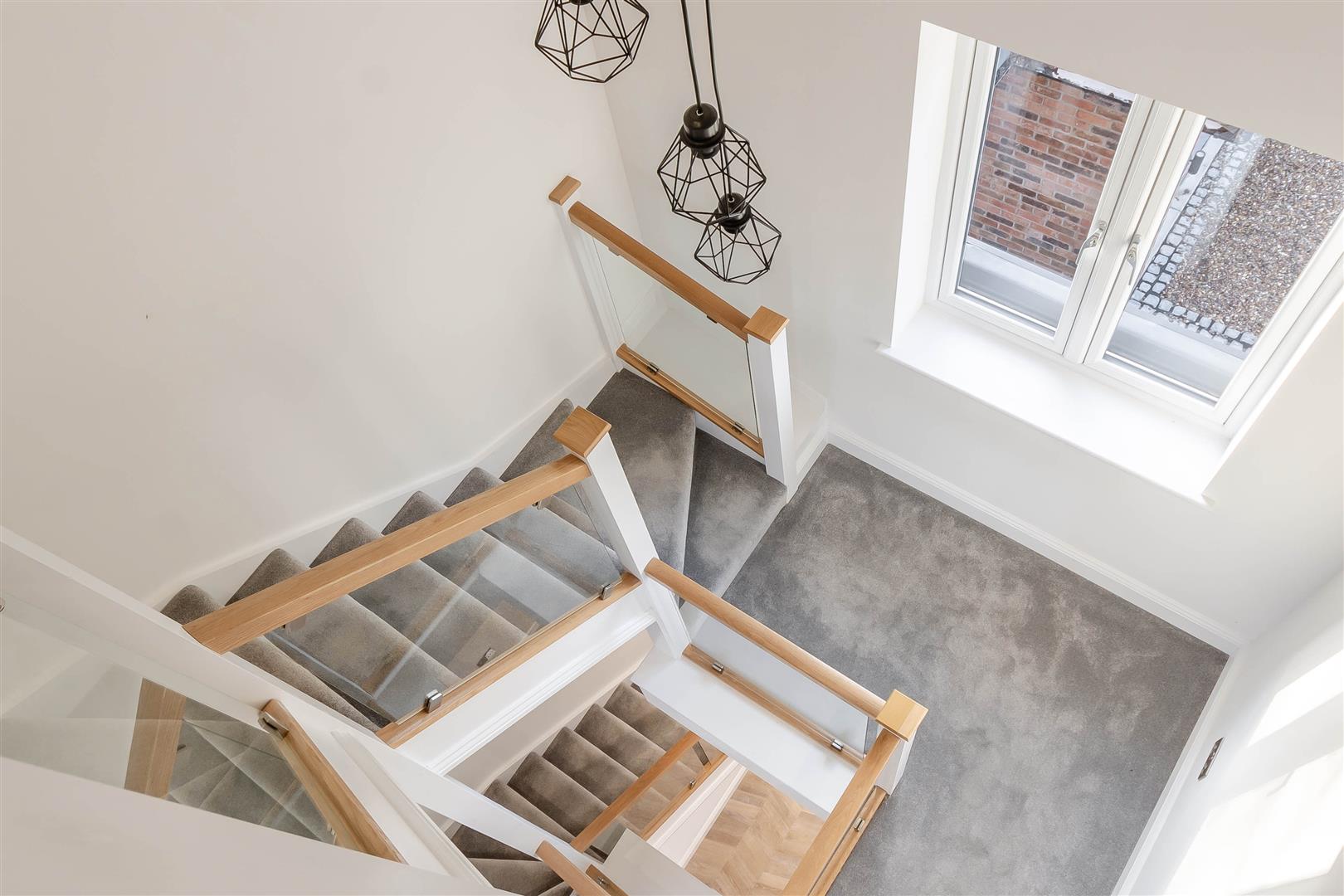 First Floor Galleried Landing - 4.09m x 2.64m (13'5" x 8'8") - With four ceiling spotlights plus feature hanging light, underfloor heating, double glazed window to the front elevation and an oak and glass staircase provides access to the second floor galleried landing.
