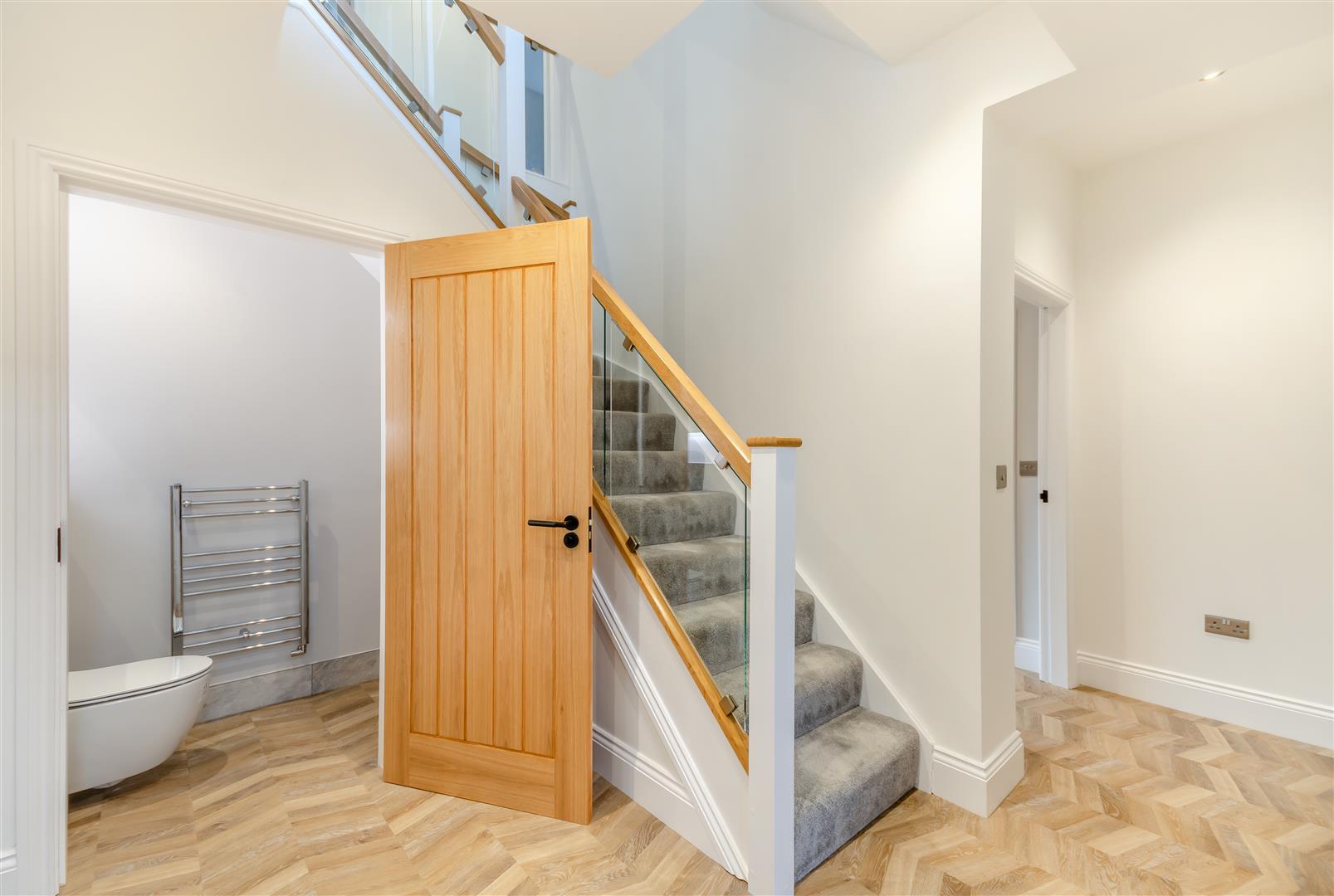 Entrance Hall - 4.22m max x 2.59m (13'10" max x 8'6") - With two double power points, underfloor heating, six ceiling spotlights and an oak and glass staircase provides access to the first floor galleried landing.