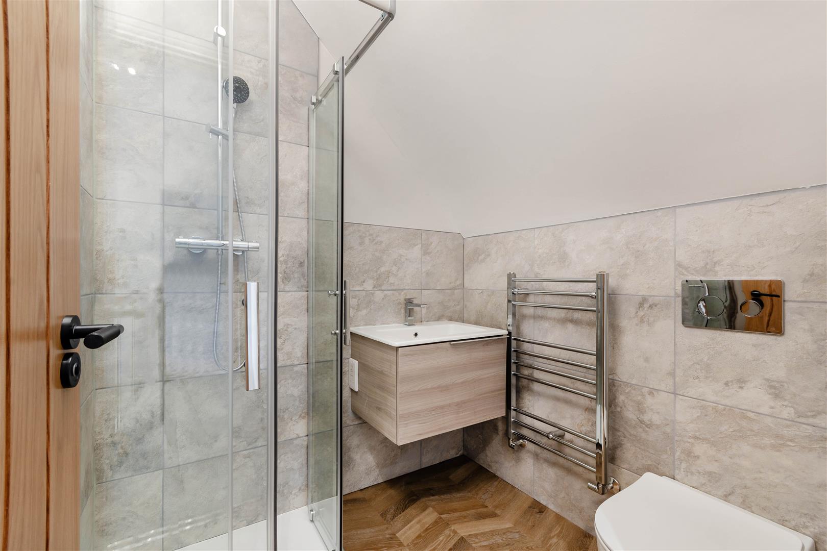 En Suite - 1.70m x 1.55m (5'7" x 5'1") - Having a modern Porcelanosa three piece white suite with chrome fittings comprising a tiled shower cubicle with rainfall shower and additional shower handset. Wall hung vanity unit with inset wash hand basin with mixer tap and storage cupboard beneath. Wall hung WC with enclosed cistern. Chrome heated towel rail, underfloor heating, two ceiling spotlights and extractor fan.