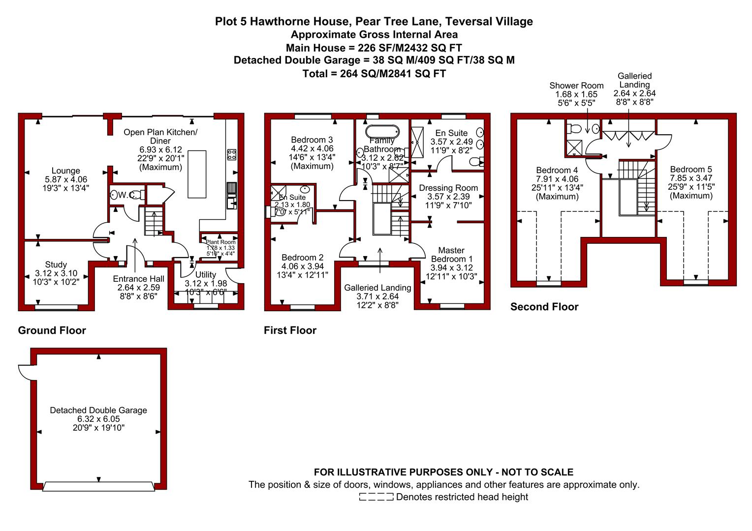 Plot 5 Hawthorne House layout of living accommodation comprises an entrance hall with bespoke oak and glass staircase rising all the way up to the first and second floor galleried landings, downstairs WC, study, spacious lounge, L-shaped open plan kitchen/diner, plant room and a utility which comes with a washing machine and a separate tumble dryer. The first floor galleried landing leads to a large master bedroom suite with a dressing room and an en suite. There are two further double bedrooms on the first floor, an en suite to bedroom two and a family bathroom. The second floor galleried landing leads to bedroom four and five and a separate shower room.