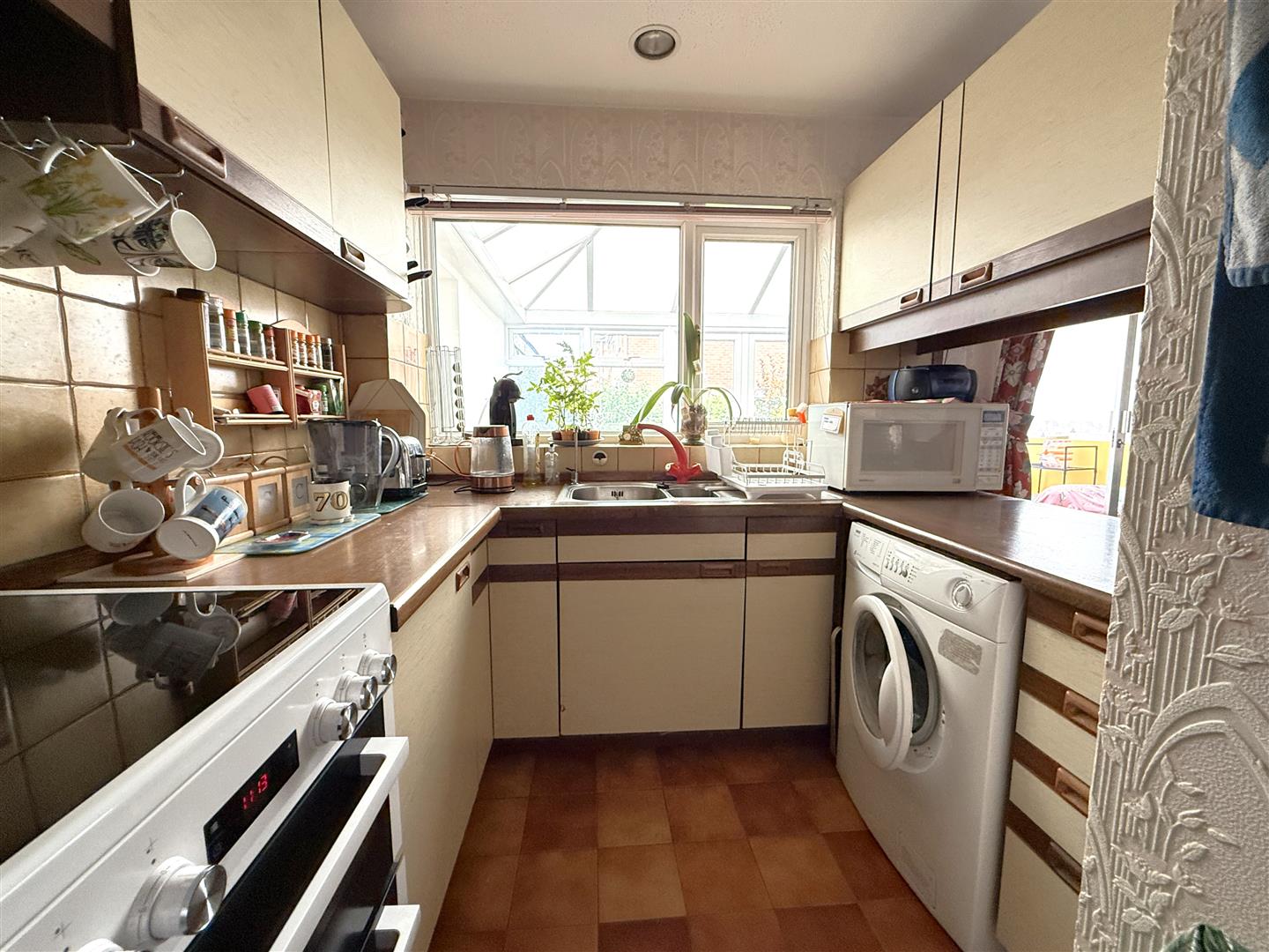 Kitchen - 2.67m x 1.98m (8'9" x 6'6") - Although likely to require a general programme of modernisation the kitchen is fitted with a generous range of wall, base and drawer units, having a U shaped configuration of laminate preparation surfaces with inset sink and drain unit with mixer tap and tiled splash backs, space for free standing cooker, plumbing for washing machine and double glazed window overlooking the conservatory.