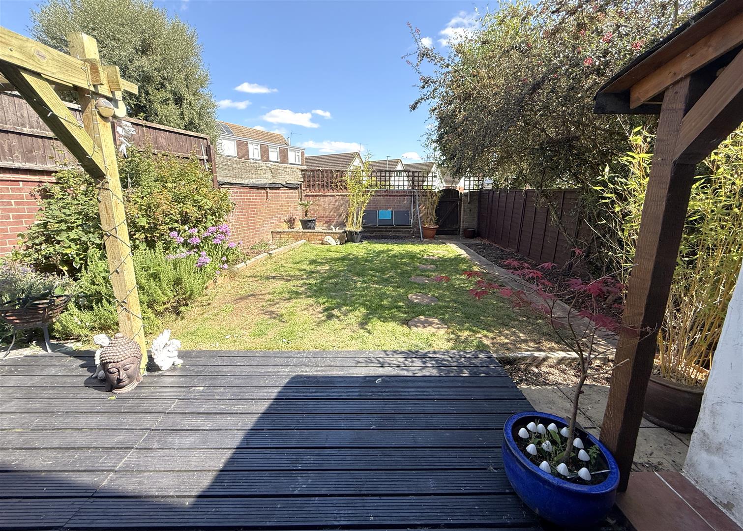 The rear garden benefits from a southerly aspect, having an initial decked terrace with covered seating area leading out onto a central lawn with well stocked perimeter borders and enclosed by panelled fencing and brick walls.