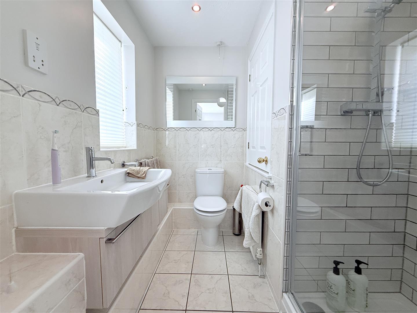 Bathroom/Shower Room - 2.59m x 2.08m (8'6" x 6'10") - Tastefully appointed having a suite comprising; panelled bath with mixer tap; separate shower enclosure with wall mounted shower mixer with rainwater rose over; close coupled WC; and vanity unit with inset washbasin; tiled splash backs and floor, towel radiator, inset downlighters to the ceiling and double glazed window to the rear.