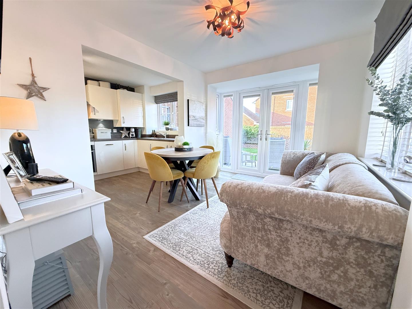 Dining Room - 3.10m (3.86m max into bay) x 2.54m (10'2" (12'8" m - A versatile reception which is large enough to accommodate both a living and dining space and opens out into the kitchen creating an everyday living/entertaining area. The room having a signature walk in box bay window to the rear with double glazed French doors and side slights with integral blinds, further double glazed window to the front, continuation of the Amtico flooring and a large open doorway into: