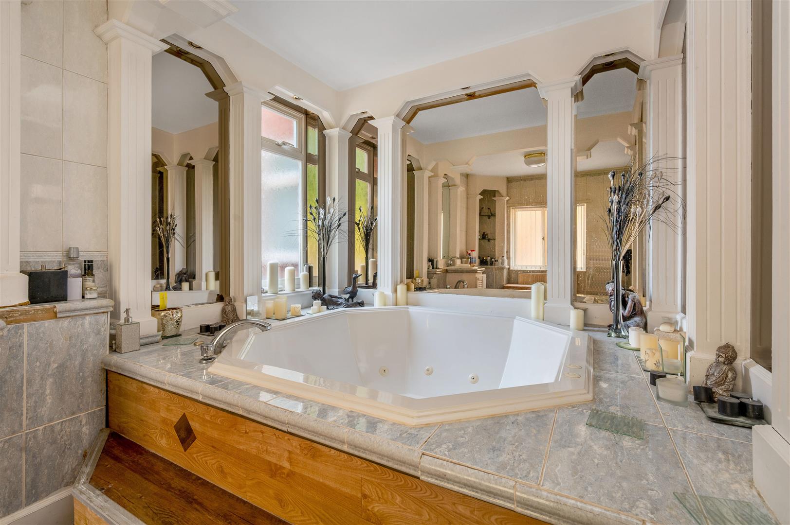Ensuite - 4.11m x 2.51m - A particularly generous space having raised bathing area with inset octagonal deep spa bath with tiled and mirrored surround, Karndean woodgrain effect flooring, vanity unit with inset wash basin and chrome mixer tap, close coupled WC and bidet, central heating radiator, ceiling light point, UPVC double glazed windows to both the rear and side elevations.