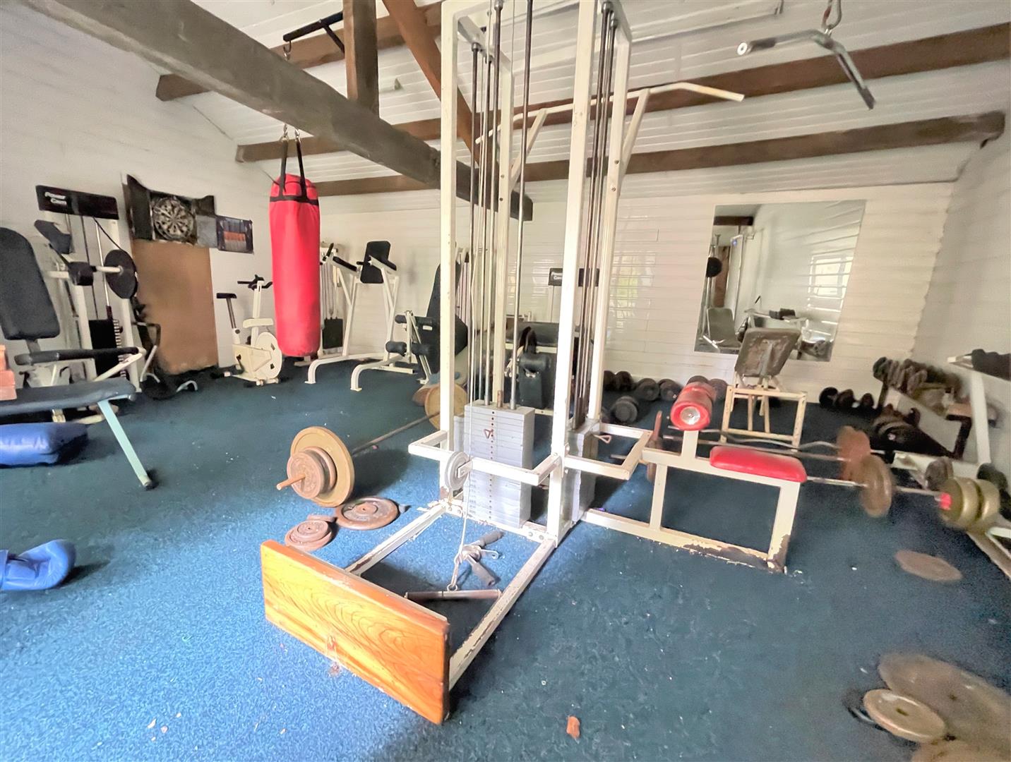 Gym - 6.96m x 6.48m - Having pitched ceiling with exposed trusses, light points, built-in storage cupboard, UPVC double glazed door to the side.