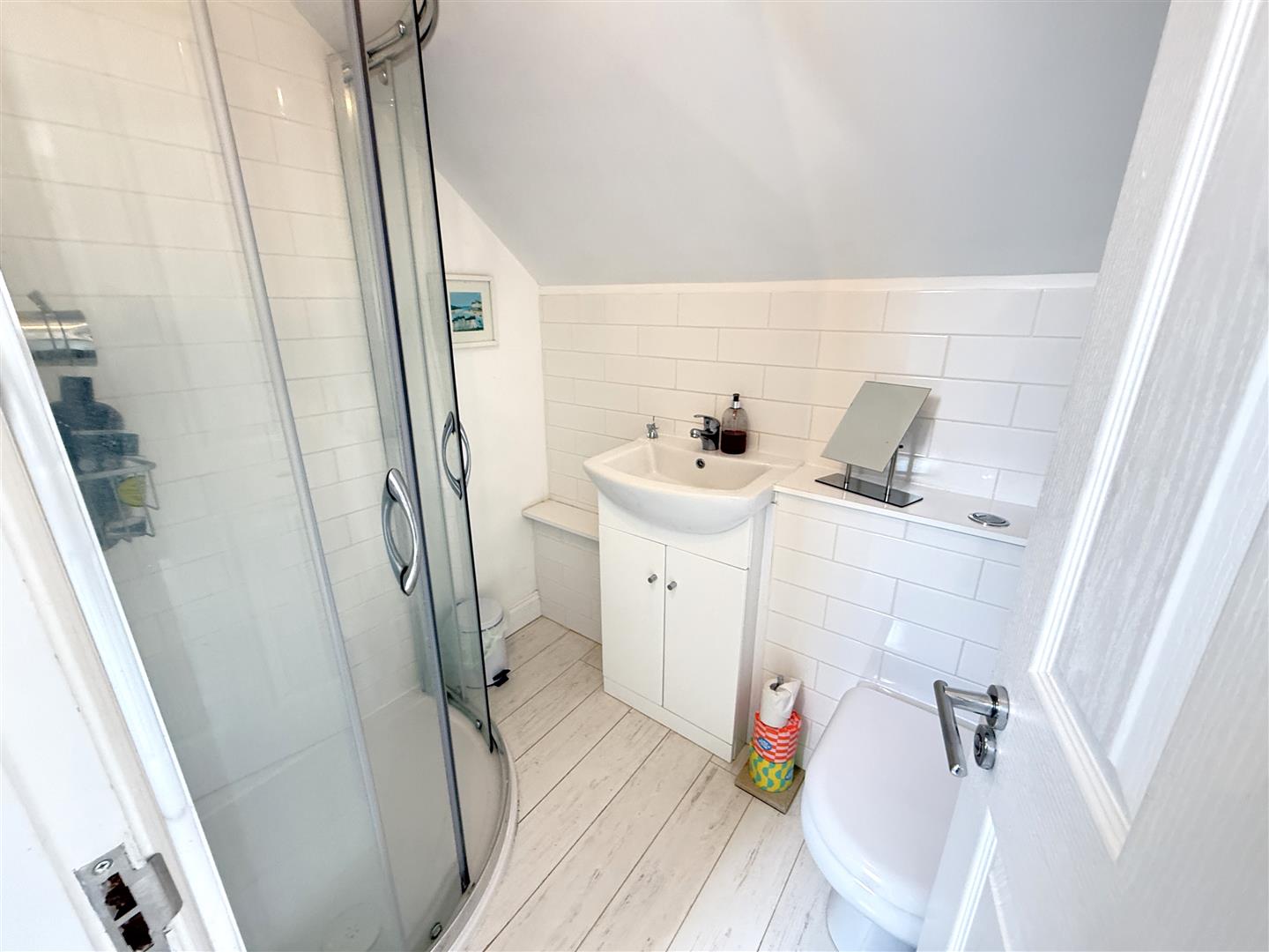 Shower Room - 1.83m x 1.42m (6'0 x 4'8) - Having a contemporary three piece white suite comprising of quadrant shower enclosure with sliding curved glass screen, chrome wall-mounted shower mixer with independent shower handset over, built-in vanity area with gloss white door fronts, over-mounted wash basin with chrome mixer tap, low flush WC with concealed cistern, white wash effect flooring, tiled splashbacks, chrome contemporary towel radiator.