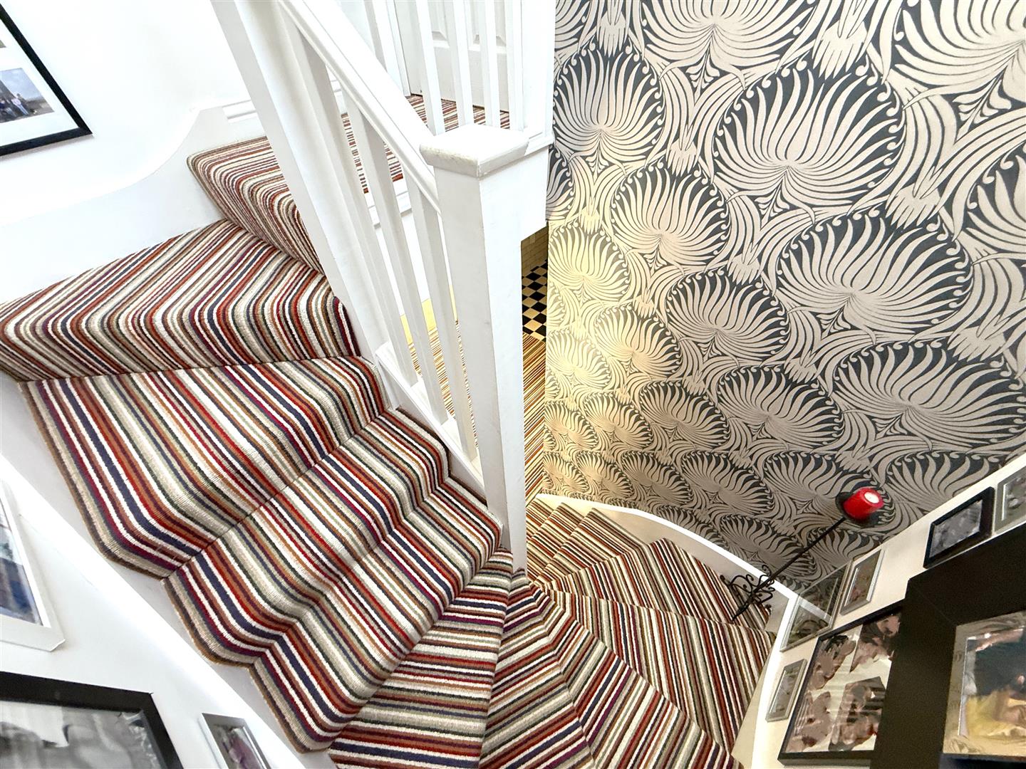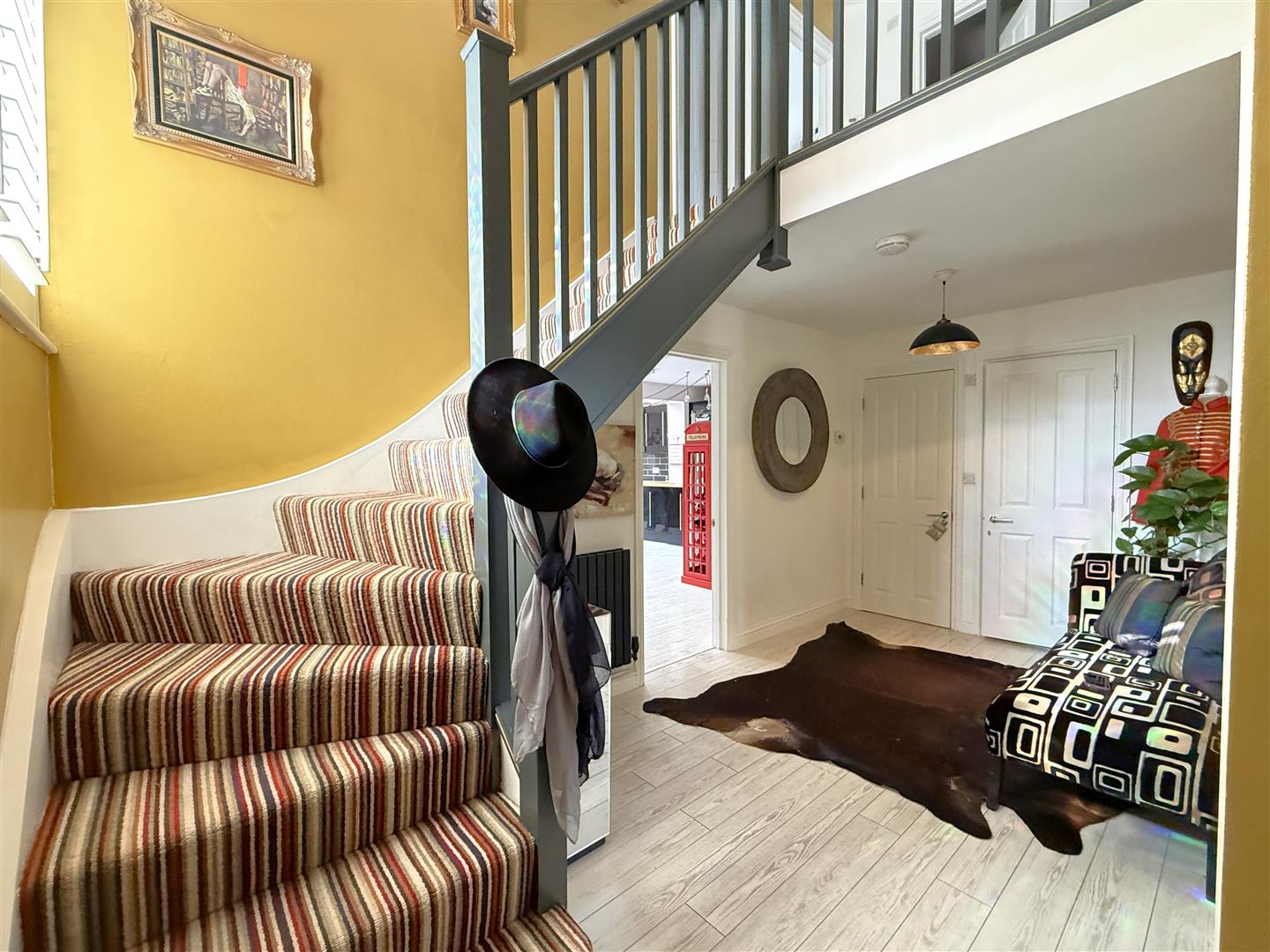 RETURNING TO THE INITIAL ENTRANCE HALL, A SPINDLE BALUSTRADE TURNING STAIRCASE RISES TO THE;