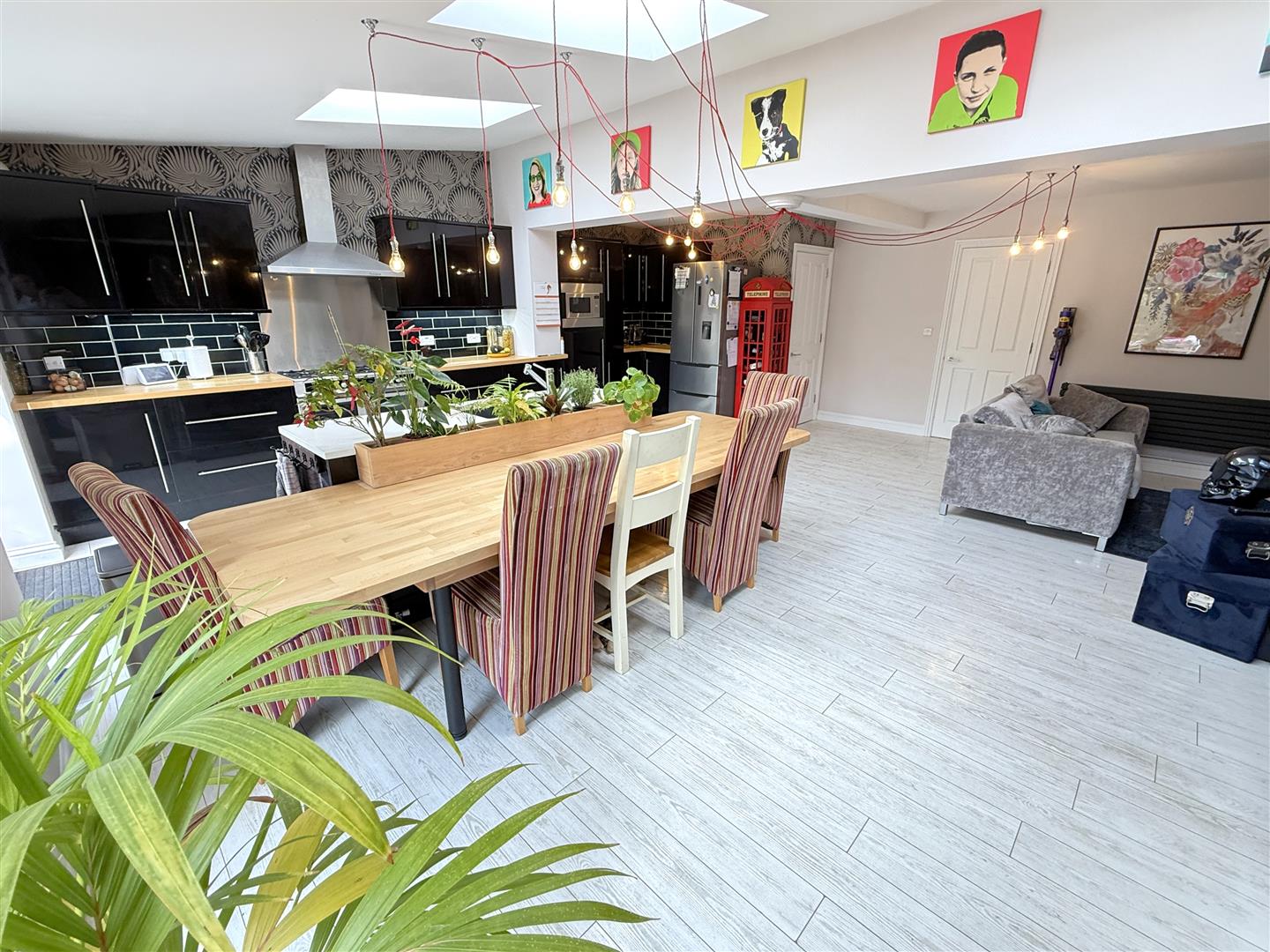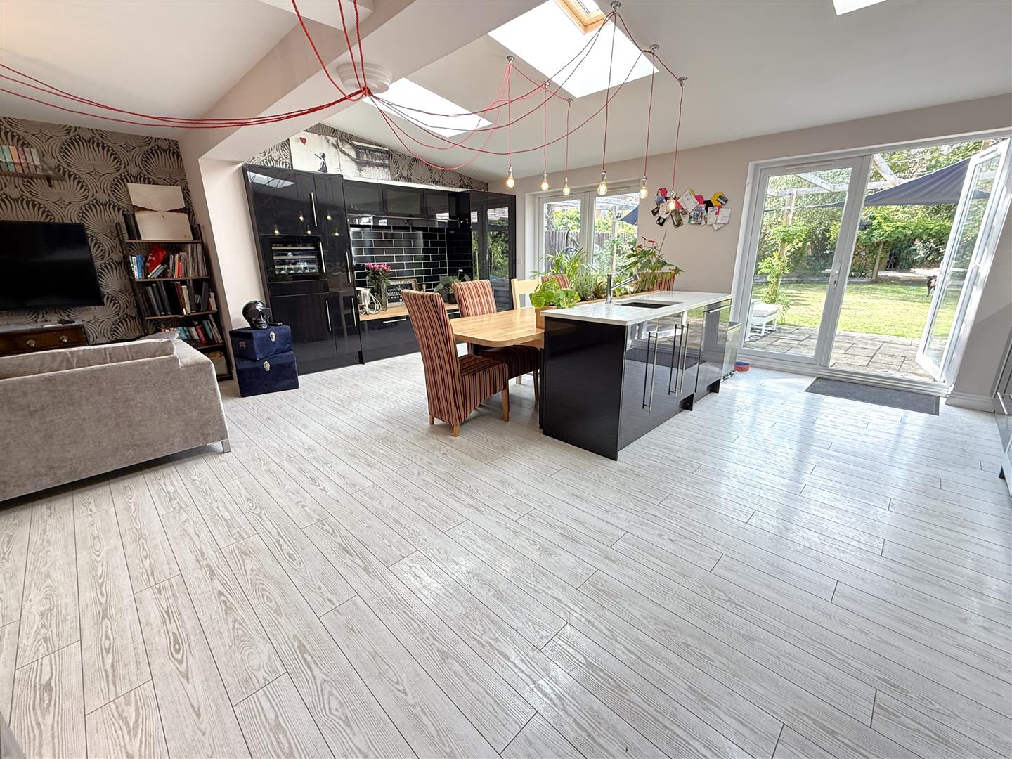 Living Dining Kitchen - 6.17m x 6.12m (20'3 x 20'1) - A stunning open plan living/dining kitchen which will undoubtedly become the hub of the home perfect for entertaining and everyday living, comprising of both a living and dining area which is open plan to a beautifully appointed kitchen with a generous range of gloss units with brush metal fittings and under unit lighting, butchers block work surfaces and complimenting island unit with granite breakfast bar and inset graphite composite bowl, sink and drainer unit and chrome articulated mixer tap, integrated appliances include dishwasher and microwave, space for free-standing gas or electric range with stainless steel chimney hood over, space for free-standing fridge freezer, Valiant gas boiler concealed behind a kitchen cupboard, continuation of white wash effect flooring, part-pitched ceiling with inset Velux skylights and two pairs of UPVC double glazed French doors leading out into the rear garden. Situated within the kitchen is a built-in airing/storage cupboard which houses the pressurised hot water system