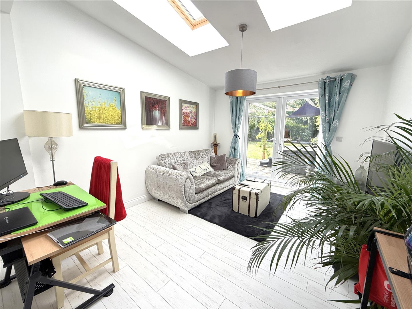 Study/Second Living Room - 4.06m x 3.23m (13'4 x 10'7) - Ideal as a home office or studio, flooded with light having two large Velux skylights and UPVC double glazed French doors leading out into the rear garden, having continuation of white washed effect flooring, ceiling light point, GRP woodgrain effect exterior door