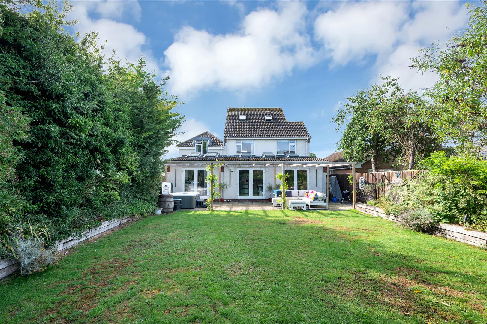 Rear Garden - A delightful rear garden, generous by modern standards enclosed to all sides, having a large central lawn with sleeper edged borders and well stocked with established trees and shrubs, and a terrace directly to the rear which gives access into the living kitchen to create an excellent outdoor entertaining space.