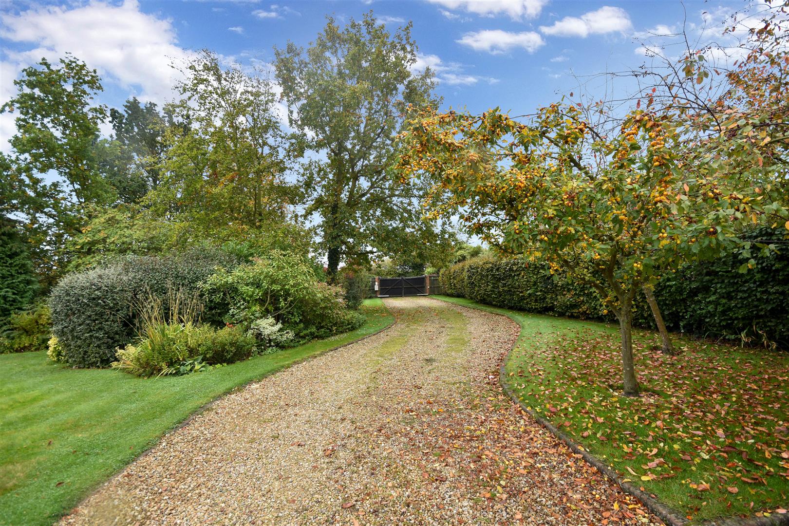 Gated access to the property is from Collingham Road with a pair of double doors leading to a gravelled driveway. The established garden contains mature trees including oak and horse chestnut. There is a lawned area and stone patio. The property has a walled boundary to High Street.