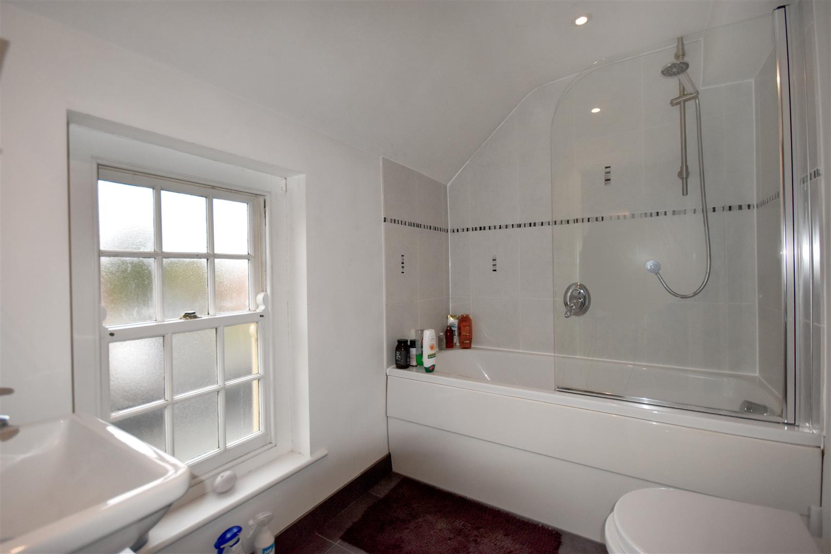 Family Bathroom - 2.41m x 1.65m (7'11 x 5'5) - Bath with shower screen, wall fixed chrome shower unit, low suite WC and basin.