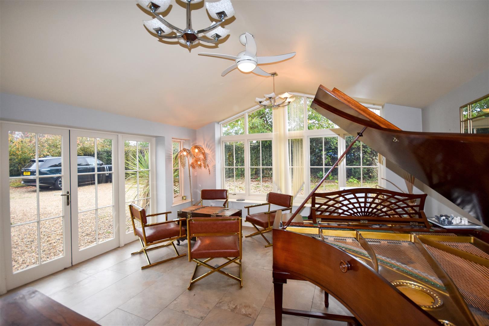 South facing French windows, west facing arch window, vaulted ceiling, tiled floor and underfloor heating.