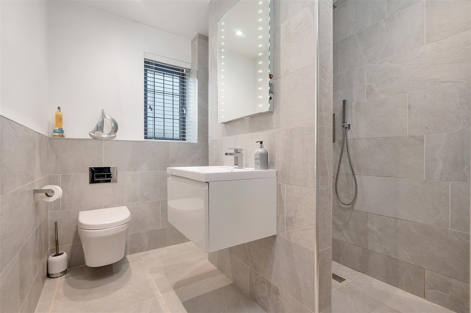 Ensuite Shower Room - 2.49m x 2.11m max (8'2" x 6'11" max) - Tastefully appointed having been modernised with a contemporary suite comprising large walk through shower wet area with flush mounted shower mixer with both independent handset and rainwater rose over, wall hung WC with concealed cistern, wall mounted washbasin with chrome mixer tap and LED mirror above, inset downlighters to the ceiling, contemporary towel radiator and double glazed window.
