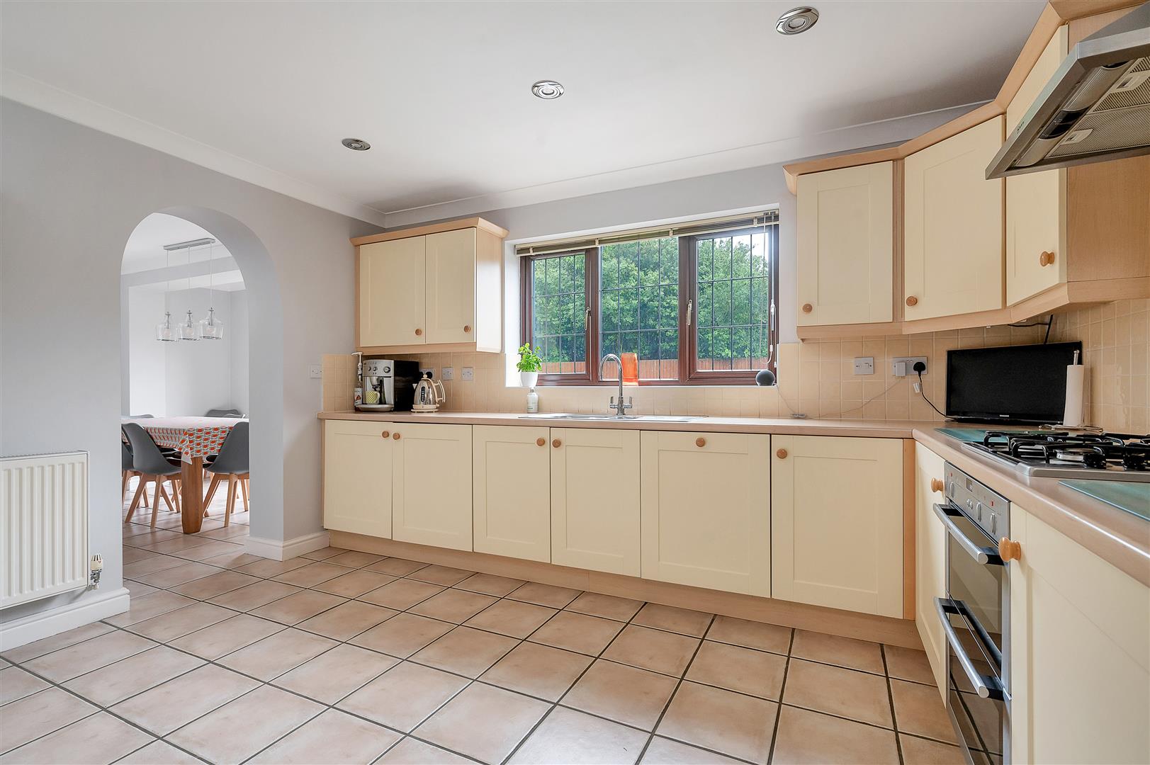 Kitchen - 3.96m x 3.63m (13' x 11'11" ) - A fully fitted kitchen offering an excellent level of built in wall, base and drawer units and having integrated appliances including Neff double oven, four ring gas hob over and under counter fridge, freezer and dishwasher, two runs of laminate preparation surfaces, one with inset stainless steel sink and drain unit with chrome mixer tap and tiled splash backs, coved ceiling, inset downlighters, central heating radiator and double glazed window overlooking the garden,