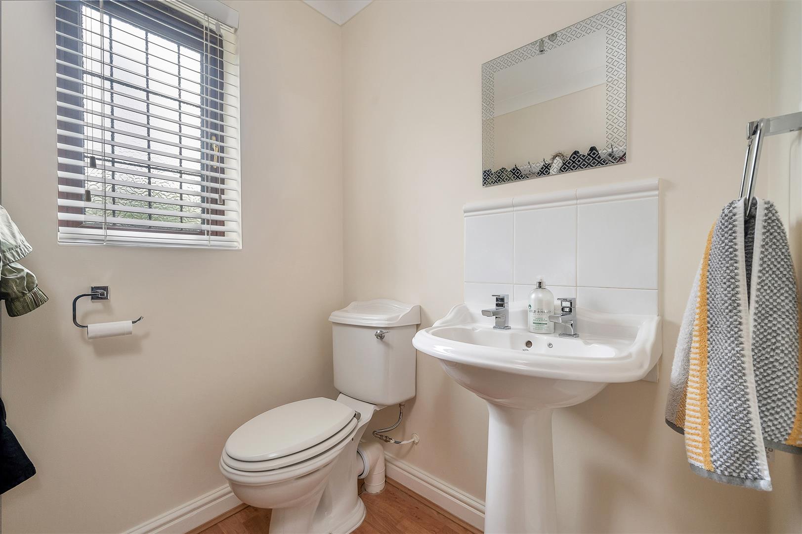 Ground Floor Cloak Room - 1.65m 1.57m (5'5" 5'2") - Having two piece white suite comprising close coupled WC, pedestal washbasin with chrome taps and tiled splash backs, ample cloaks hanging space, coved ceiling and double glazed window.