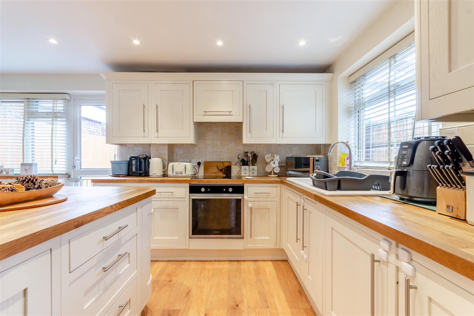Open Plan Kitchen/Diner - 5.03m x 3.30m (16'6" x 10'10") - A modern open plan kitchen/diner featuring a modern fitted kitchen and spacious adjacent dining area, this creating a duel purpose living and cooking space partially separated by a high quality matching island unit making this the ideal hub of any family home. The kitchen has a range of wall and base units with solid wood butchers block work surfaces, island unit with space saving corner units, drawers and storage space with soft closing doors. The main section of the kitchen having the benefit of integrated appliances, featuring a multi function oven, four ring electric hob and extractor hood with pull out canopy matching the high level units. Inset sink unit with chrome swan-neck mixer tap and splashback tiling. Plumbing for washing machine and space for a fridge/freezer. Double glazed window to the rear and side elevations, UPVC rear door giving access to the garden, laminate floor, ceiling spotlights and open archway through to the: